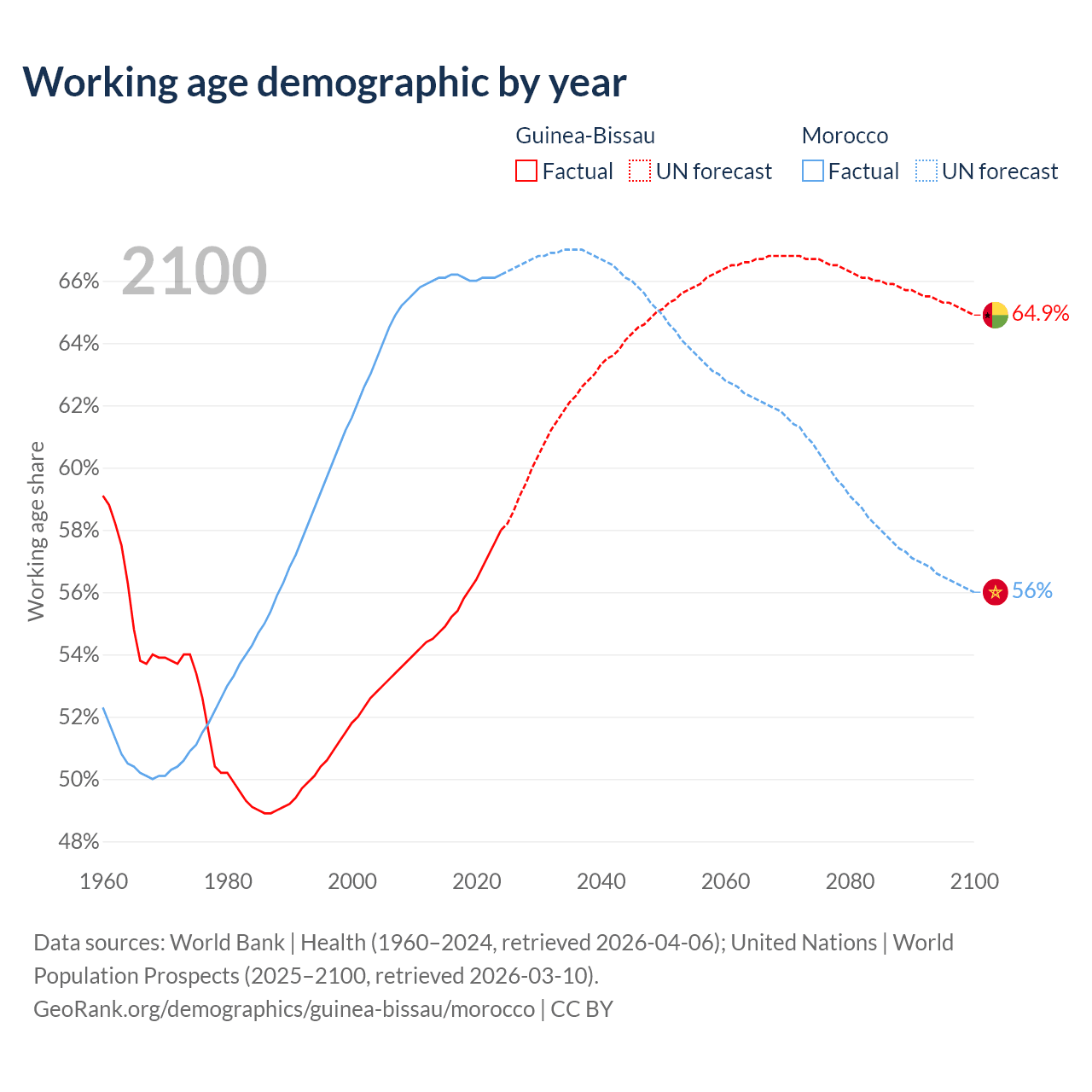 Median age Guinea-Bissau vs Morocco, 1960-2100