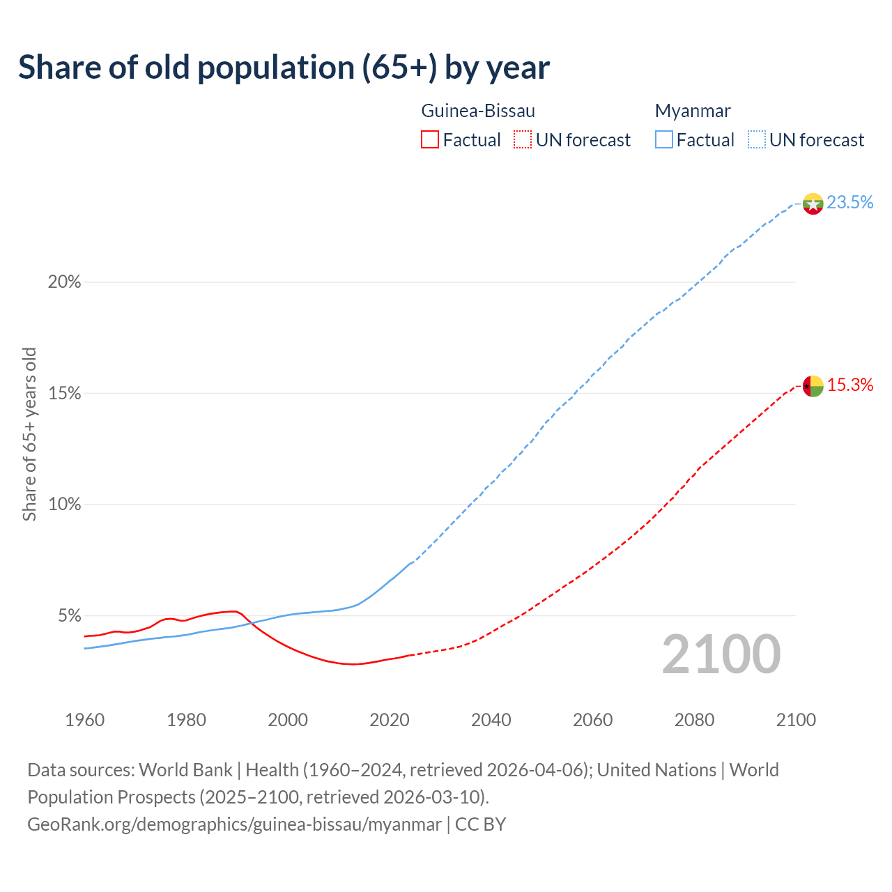 - The share of old-age demographic (65+) in Guinea-Bissau is 3.19% vs 7.3% in Myanmar.