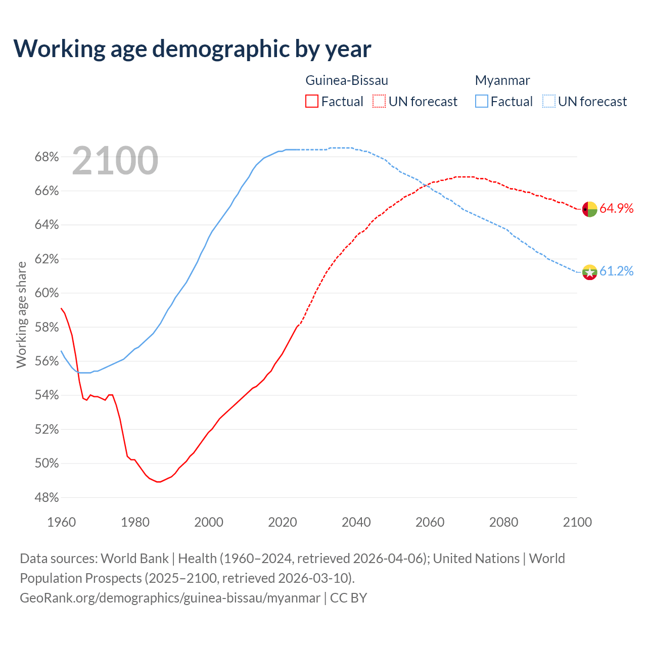 - Guinea-Bissau has 1.34M working age adults (aged 15-64) vs 37.8M in Myanmar.