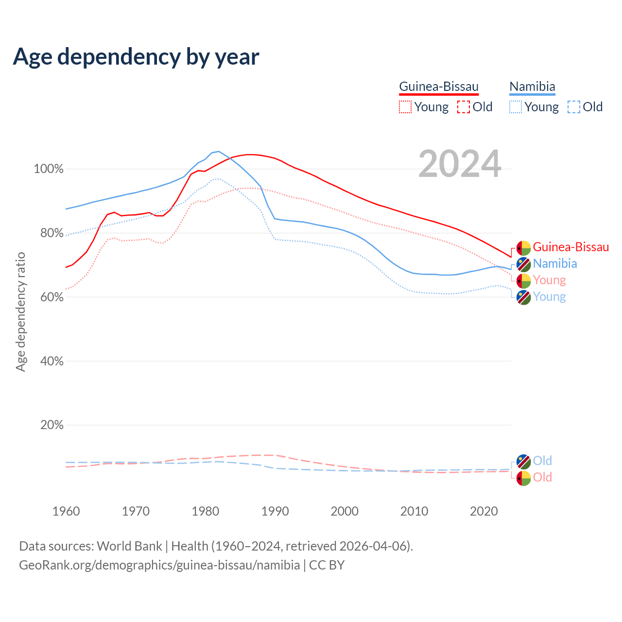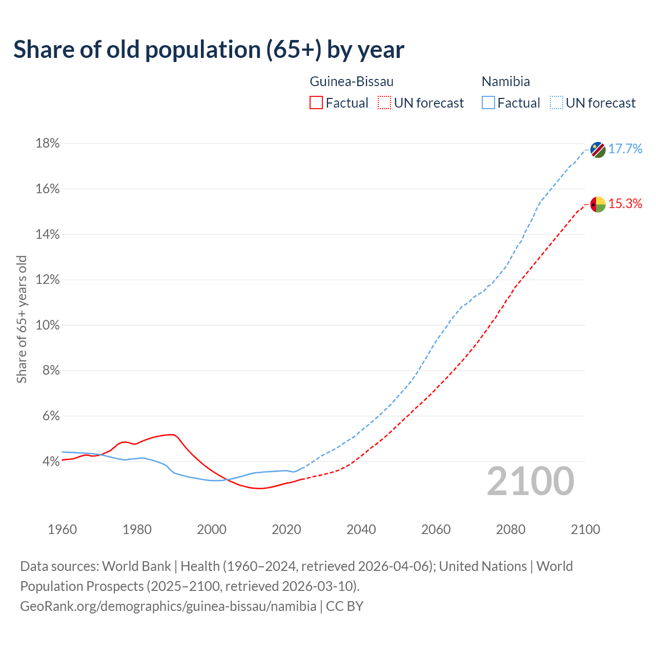 - The share of old-age demographic (65+) in Guinea-Bissau is 3.19% vs 3.67% in Namibia.