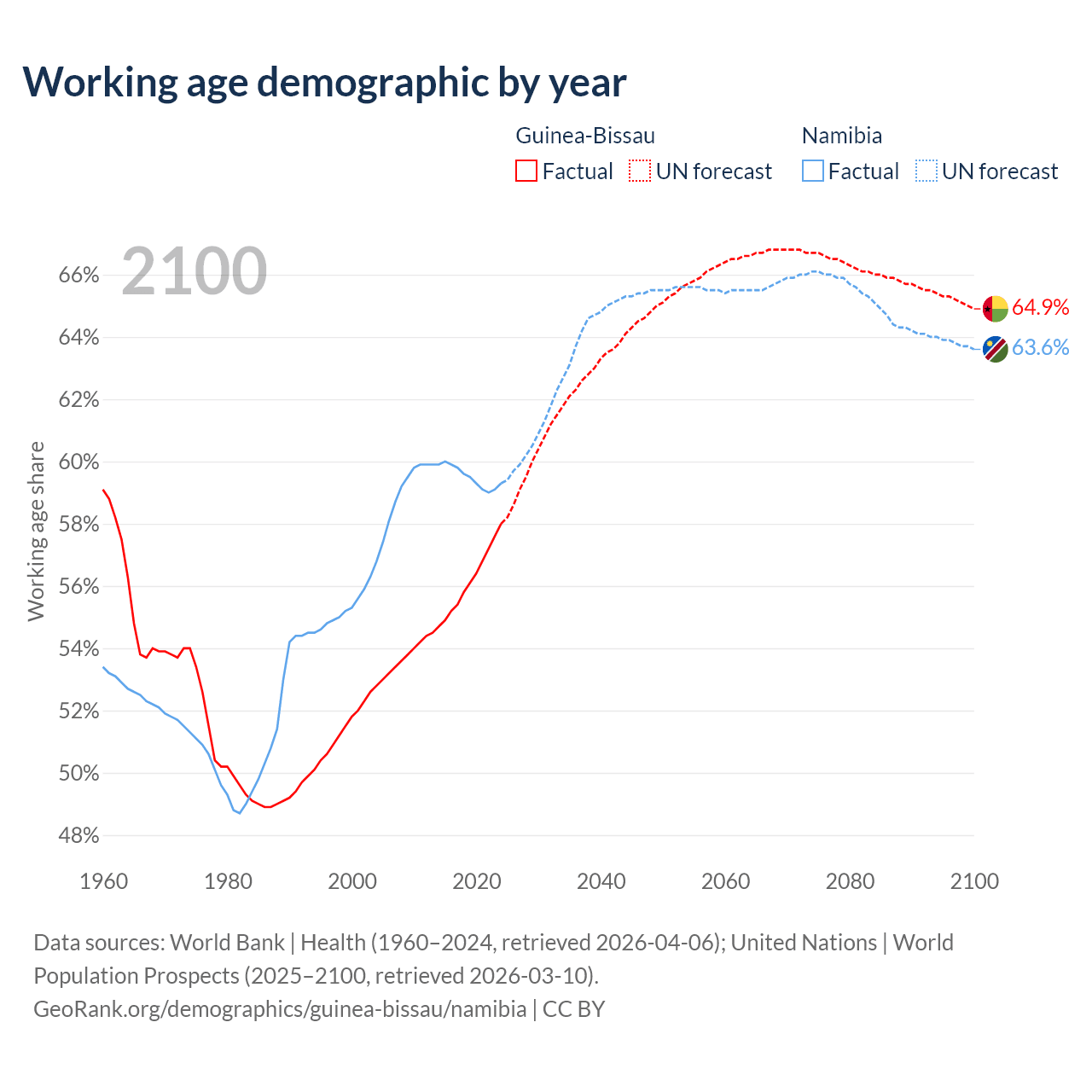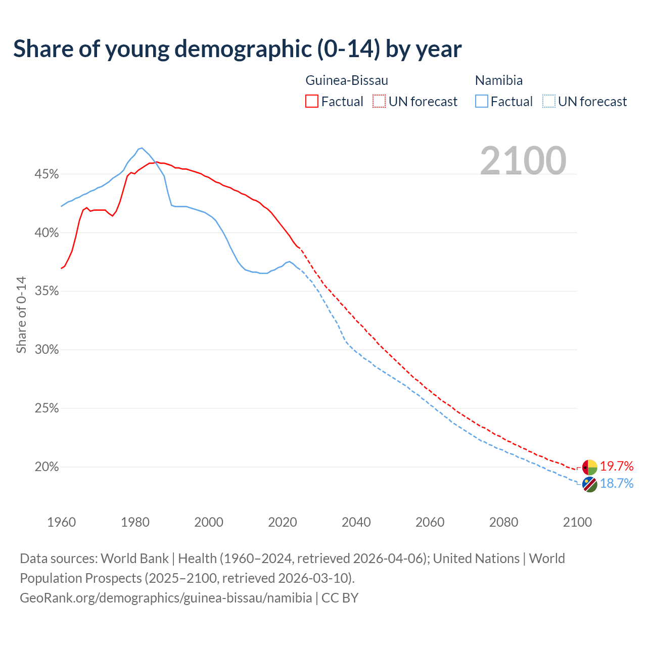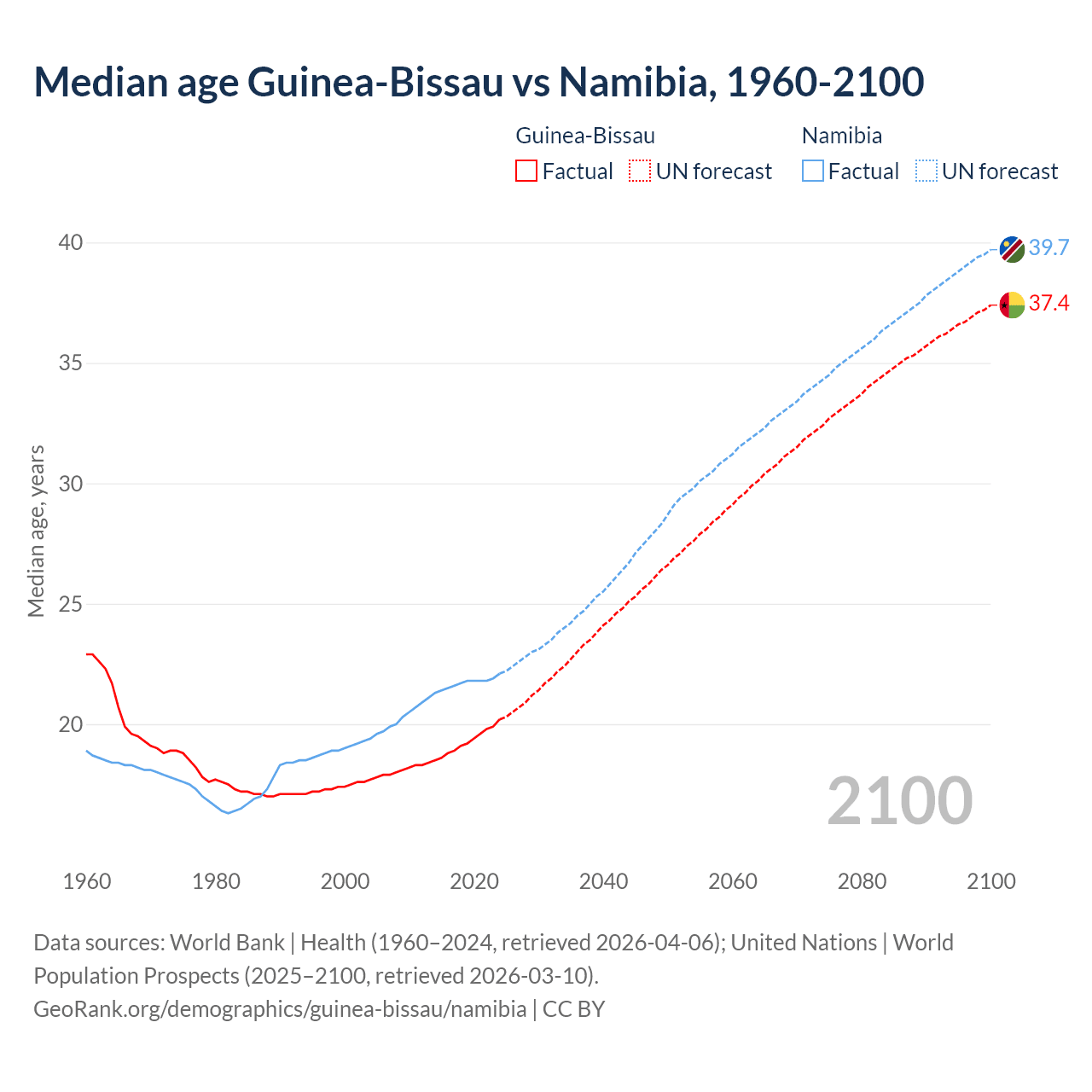 Median age Guinea-Bissau vs Namibia, 1960-2100