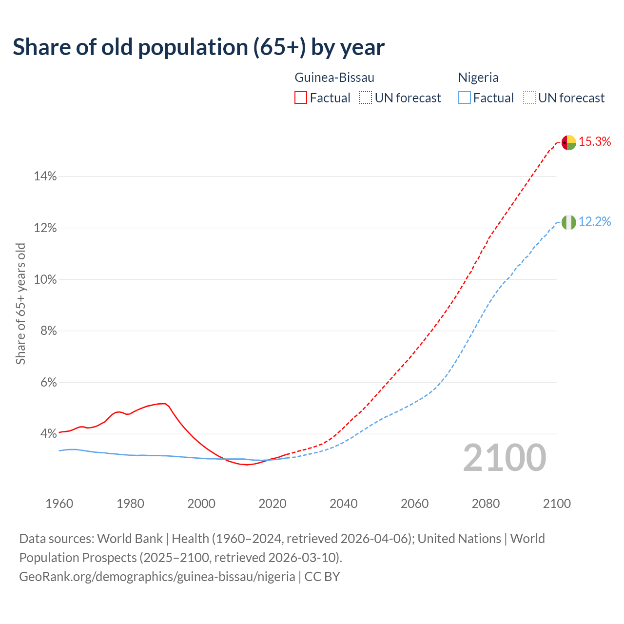 The share of older people aged 65 and over is 3.19% in Guinea-Bissau and 3.05% in Nigeria. Life expectancy in Guinea-Bissau compared to Nigeria .