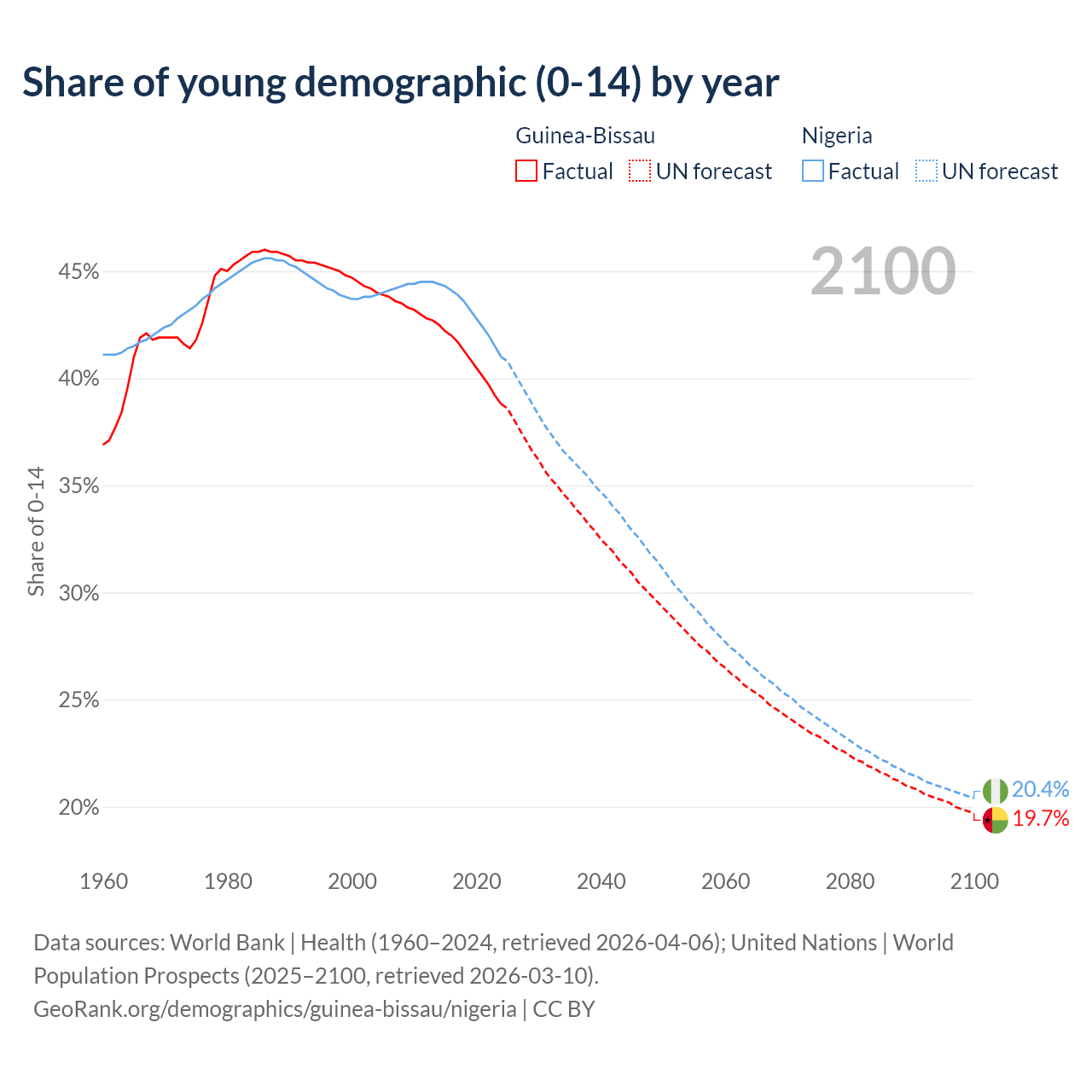 - The share of old-age demographic (65+) in Guinea-Bissau is 3.19% vs 3.05% in Nigeria.