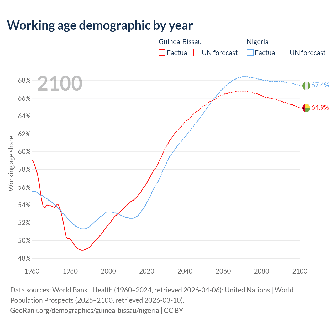 - Guinea-Bissau has 1.34M working age adults (aged 15-64) vs 136M in Nigeria.