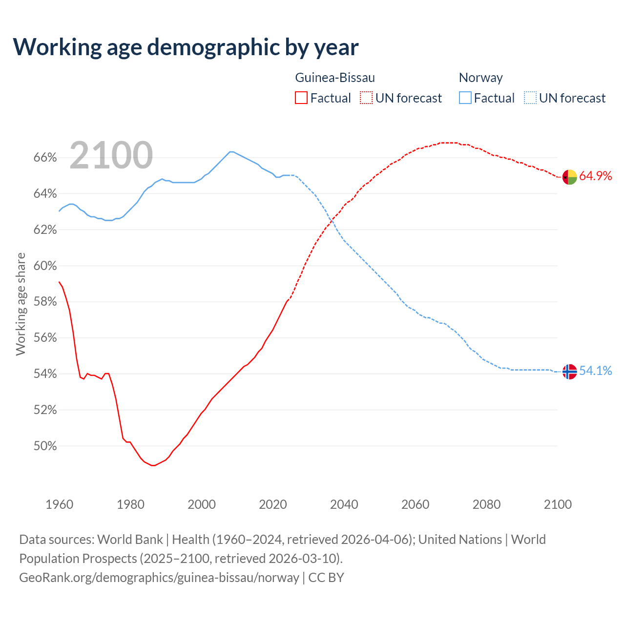 - Guinea-Bissau has 1.34M working age adults (aged 15-64) vs 3.69M in Norway.