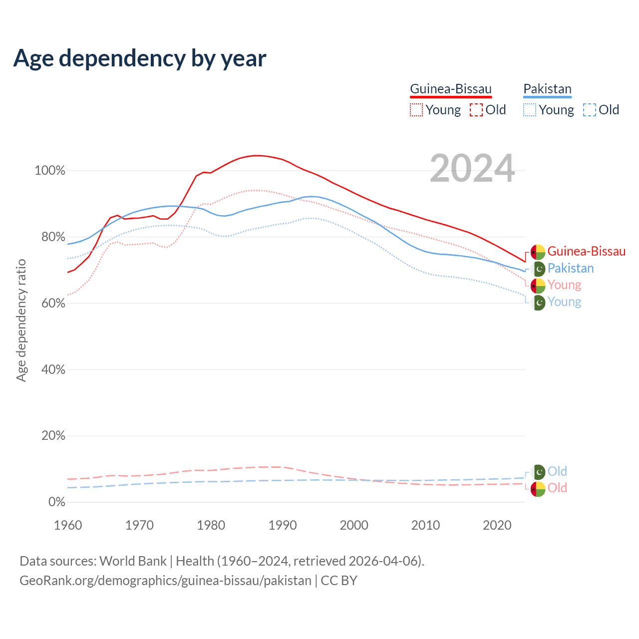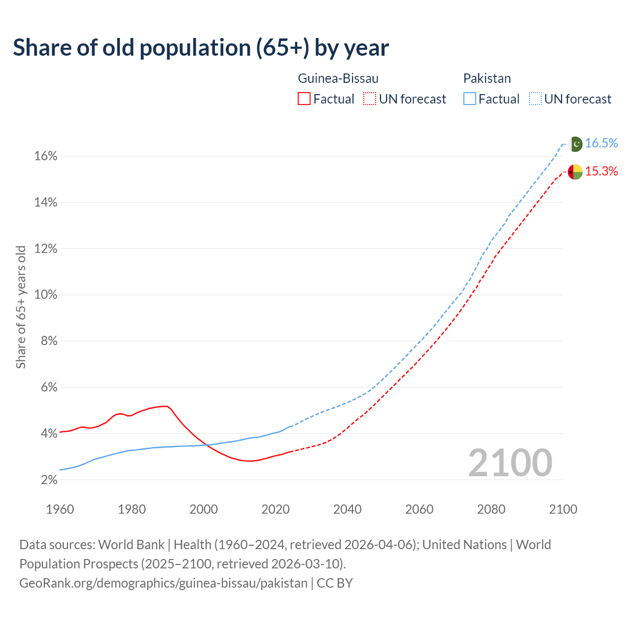 - The share of old-age demographic (65+) in Guinea-Bissau is 3.19% vs 4.28% in Pakistan.