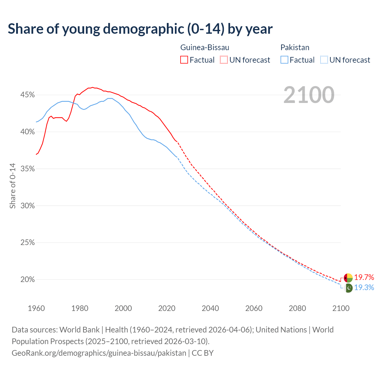 - The share of young demographic (0-15 years old) in Guinea-Bissau is 38.8% vs 36.7% in Pakistan.