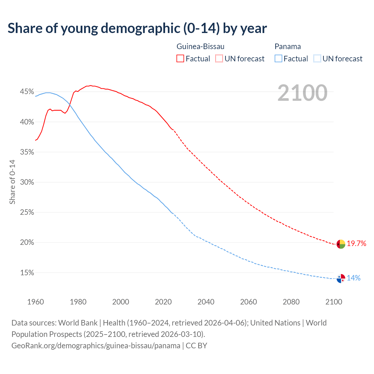 - The share of young demographic (0-15 years old) in Guinea-Bissau is 38.8% vs 24.9% in Panama.
