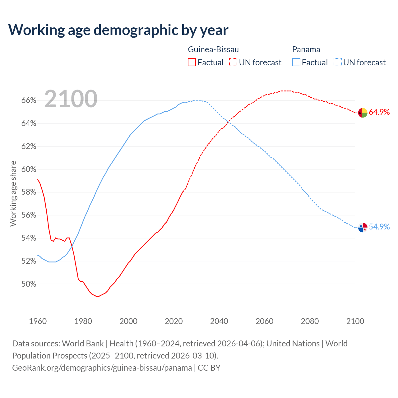 - The share of old-age demographic (65+) in Guinea-Bissau is 3.19% vs 9.35% in Panama.