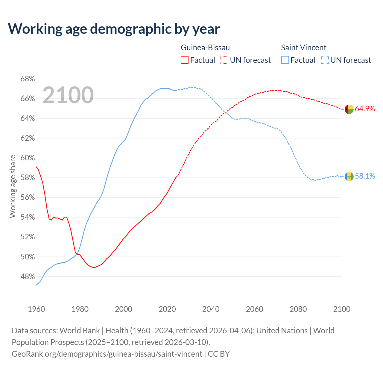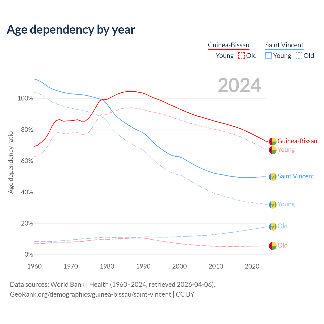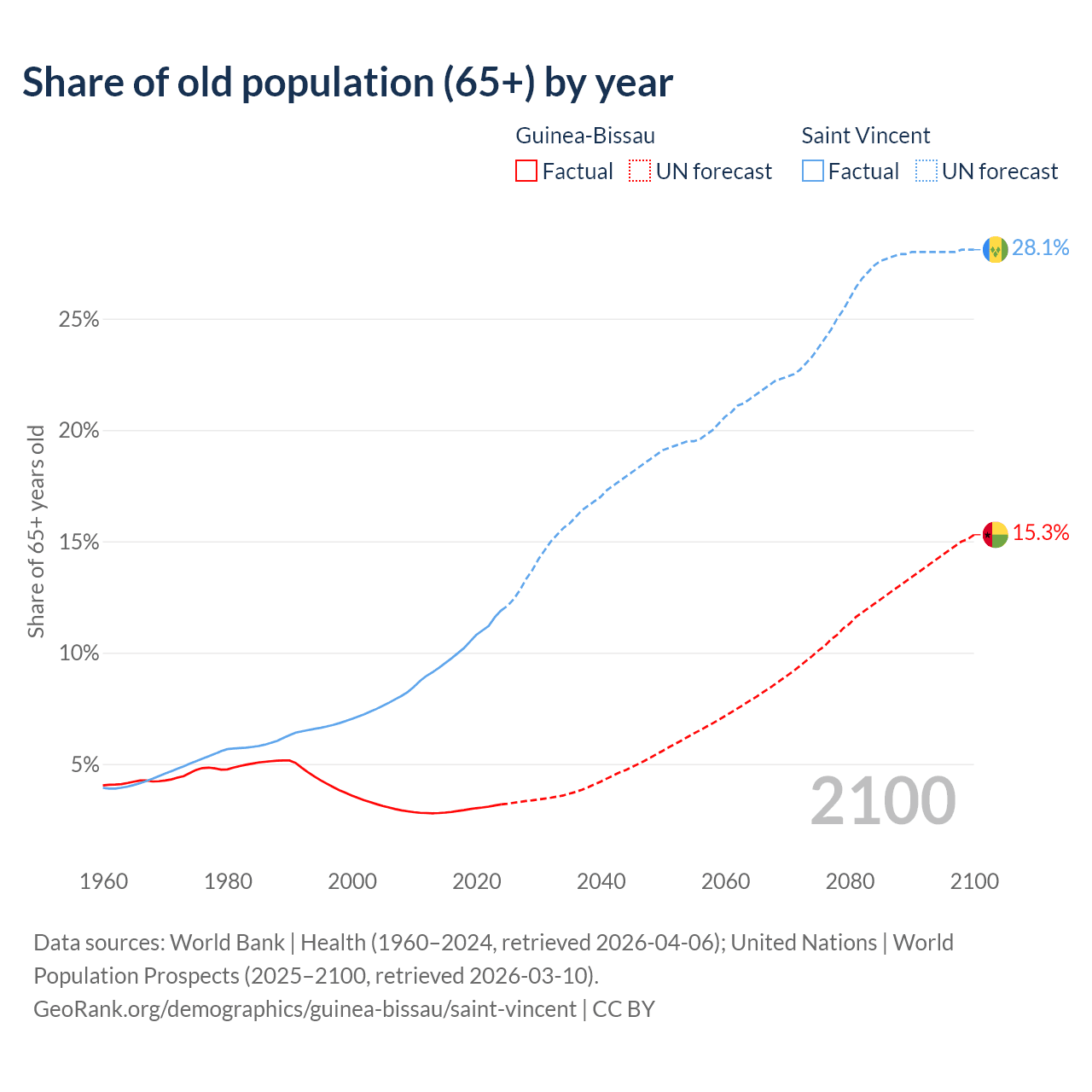 - The share of old-age demographic (65+) in Guinea-Bissau is 3.19% vs 11.9% in Saint Vincent.