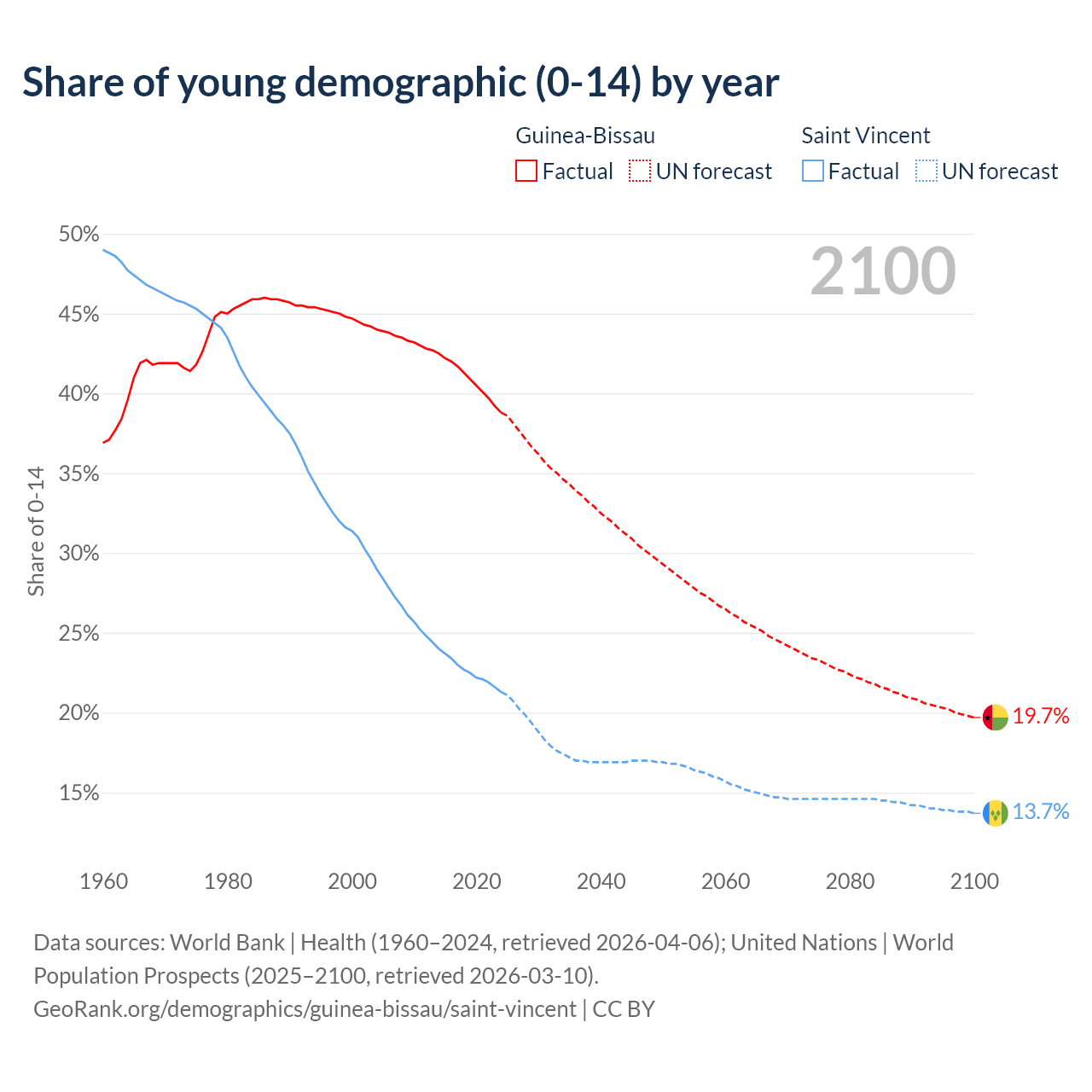 - The share of young demographic (0-15 years old) in Guinea-Bissau is 38.8% vs 21.3% in Saint Vincent.