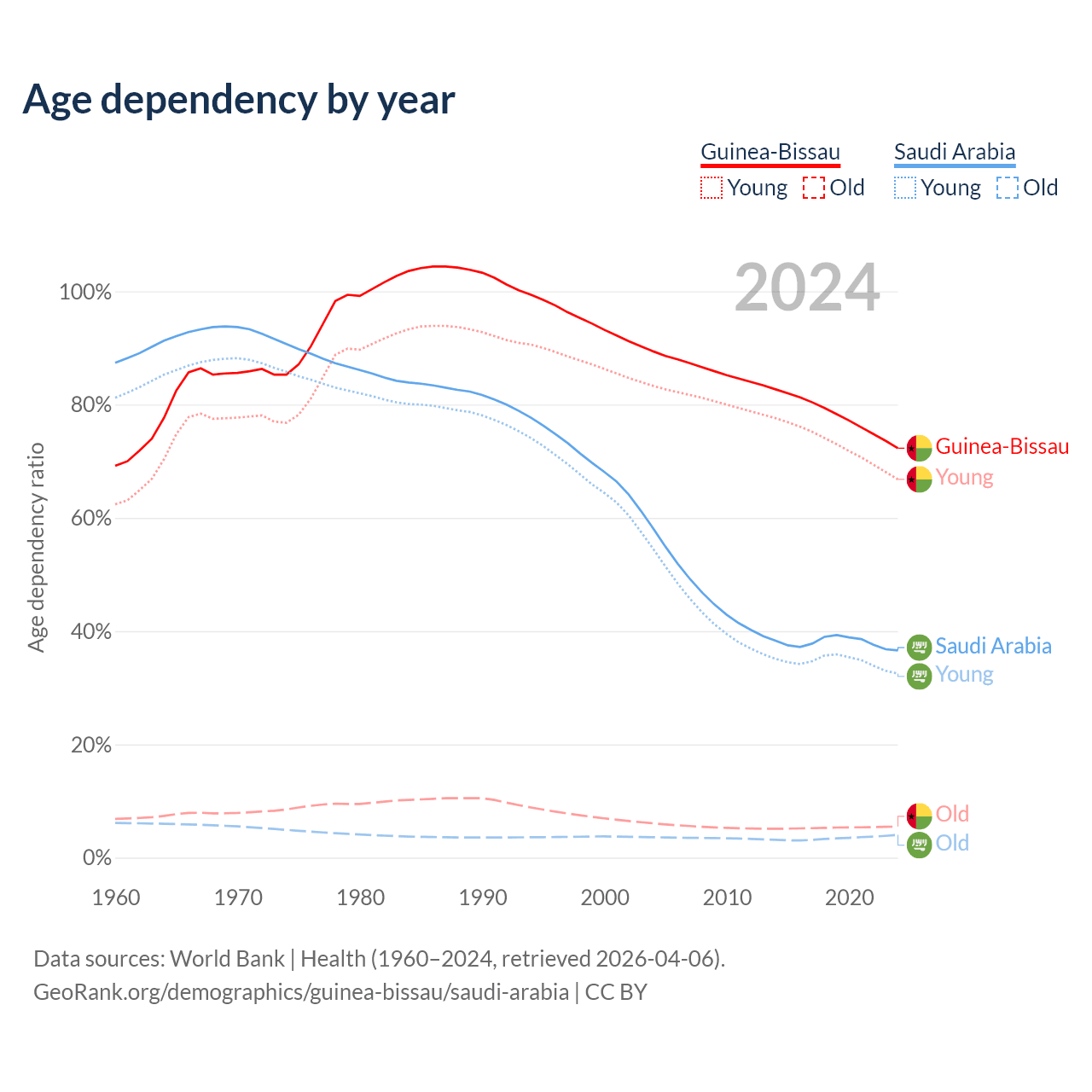 - The share of old-age demographic (65+) in Guinea-Bissau is 3.19% vs 2.95% in Saudi Arabia.