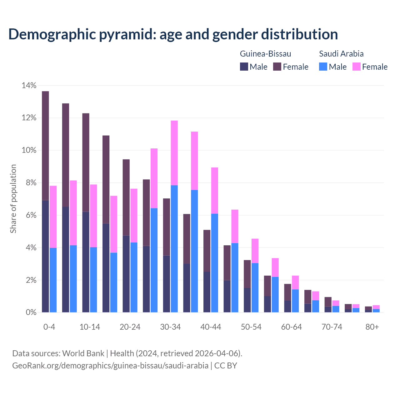 - The share of young demographic (0-15 years old) in Guinea-Bissau is 38.8% vs 23.8% in Saudi Arabia.