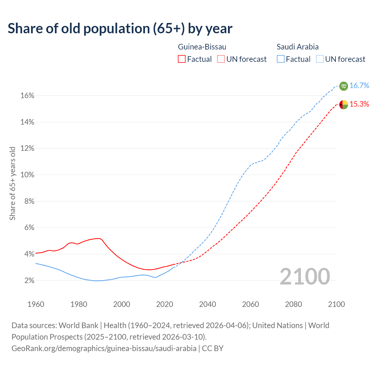 The share of older people aged 65 and over is 3.19% in Guinea-Bissau and 2.95% in Saudi Arabia. Life expectancy in Guinea-Bissau compared to Saudi Arabia .