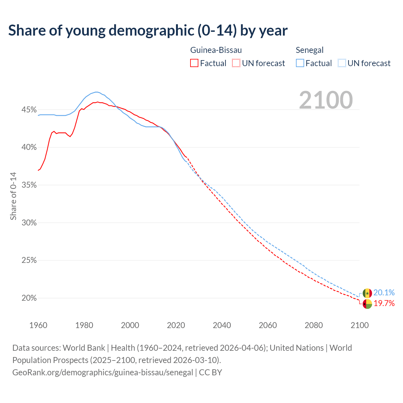 - The share of young demographic (0-15 years old) in Guinea-Bissau is 38.8% vs 38.2% in Senegal.