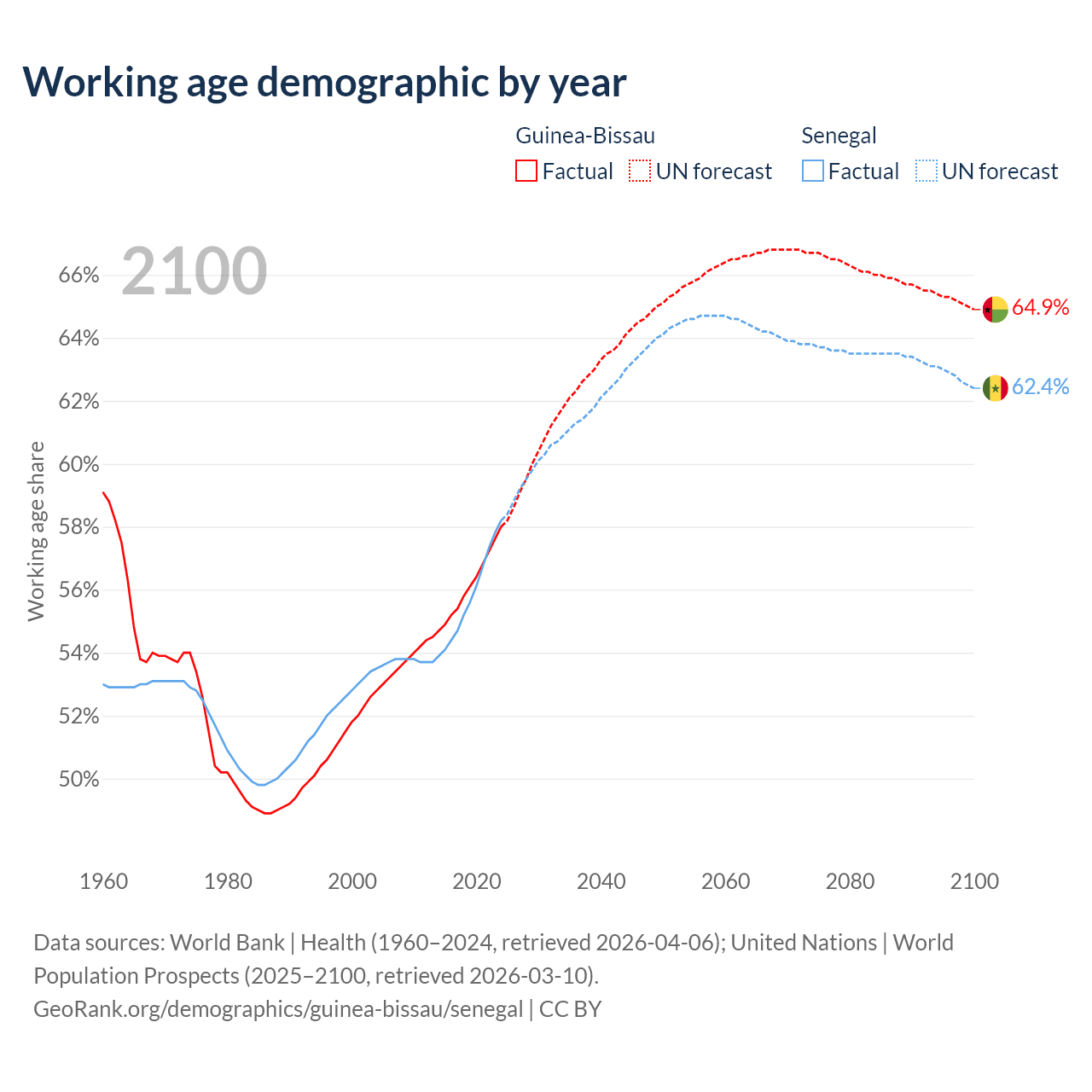 The share of older people aged 65 and over is 3.19% in Guinea-Bissau and 3.62% in Senegal. Life expectancy in Guinea-Bissau compared to Senegal .