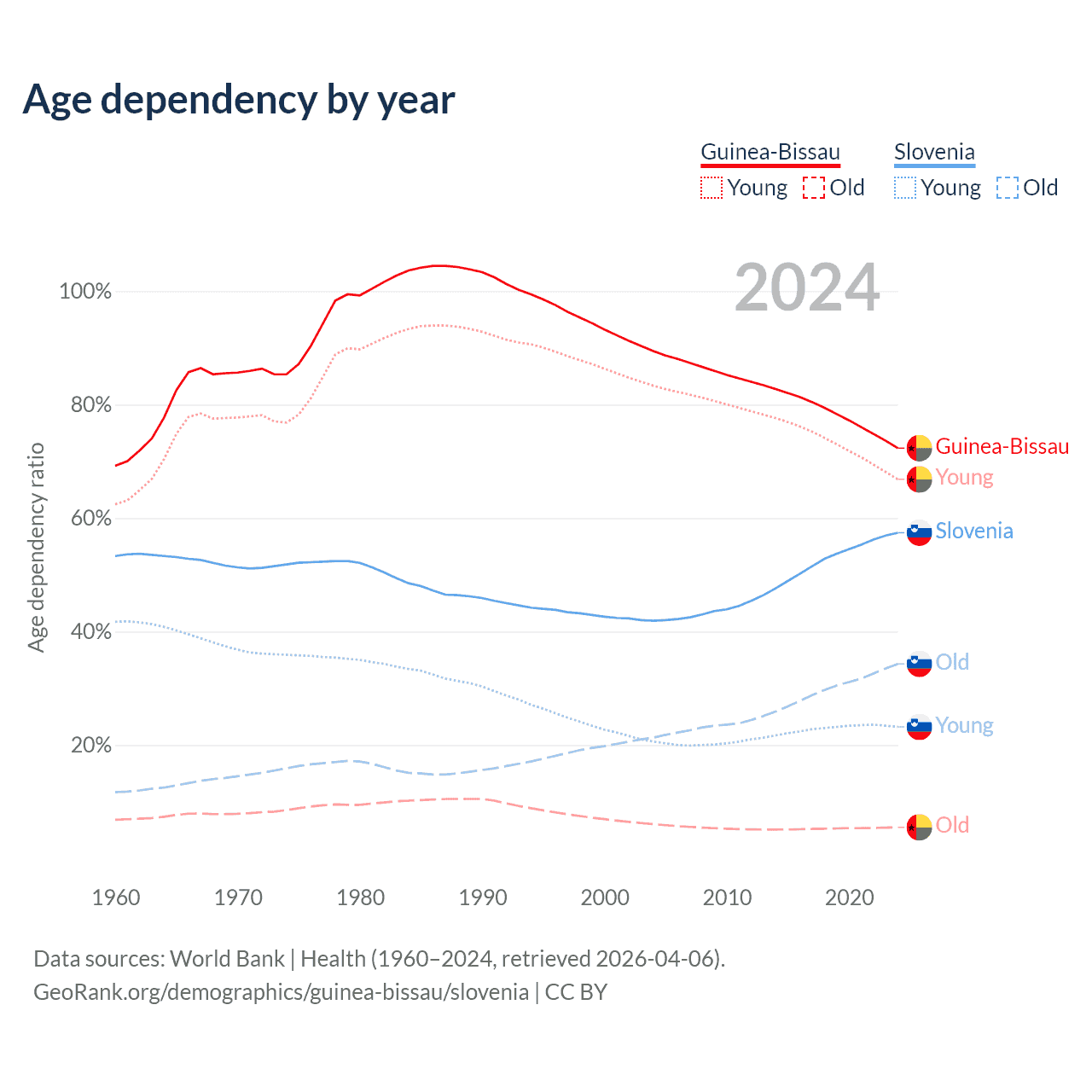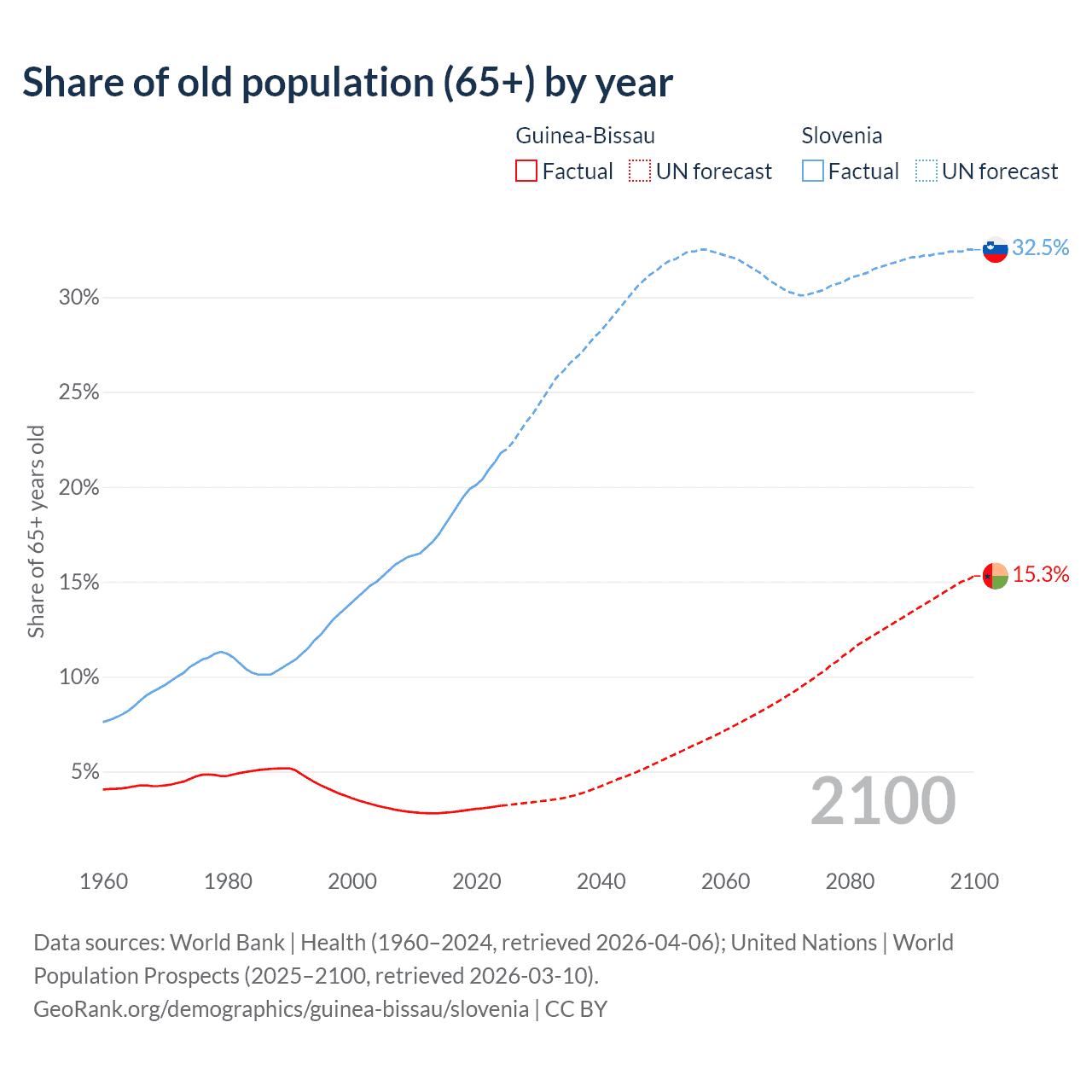 - The share of old-age demographic (65+) in Guinea-Bissau is 3.19% vs 21.8% in Slovenia.