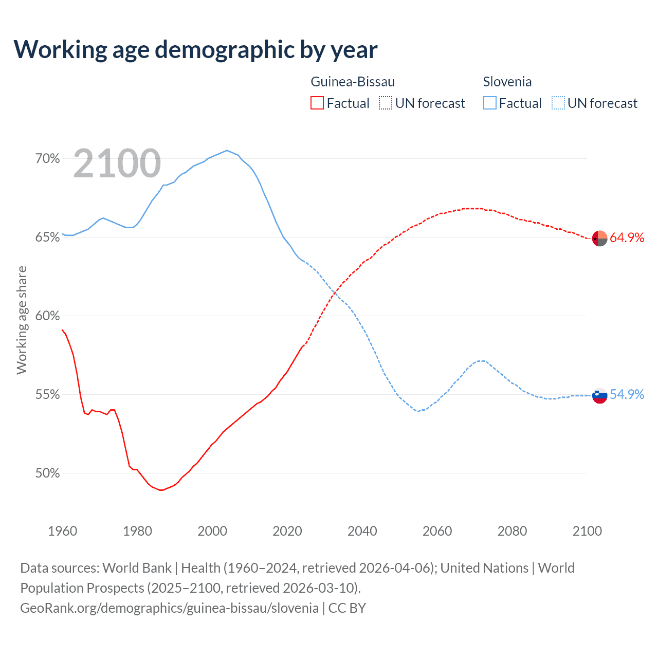 - Guinea-Bissau has 1.34M working age adults (aged 15-64) vs 1.35M in Slovenia.