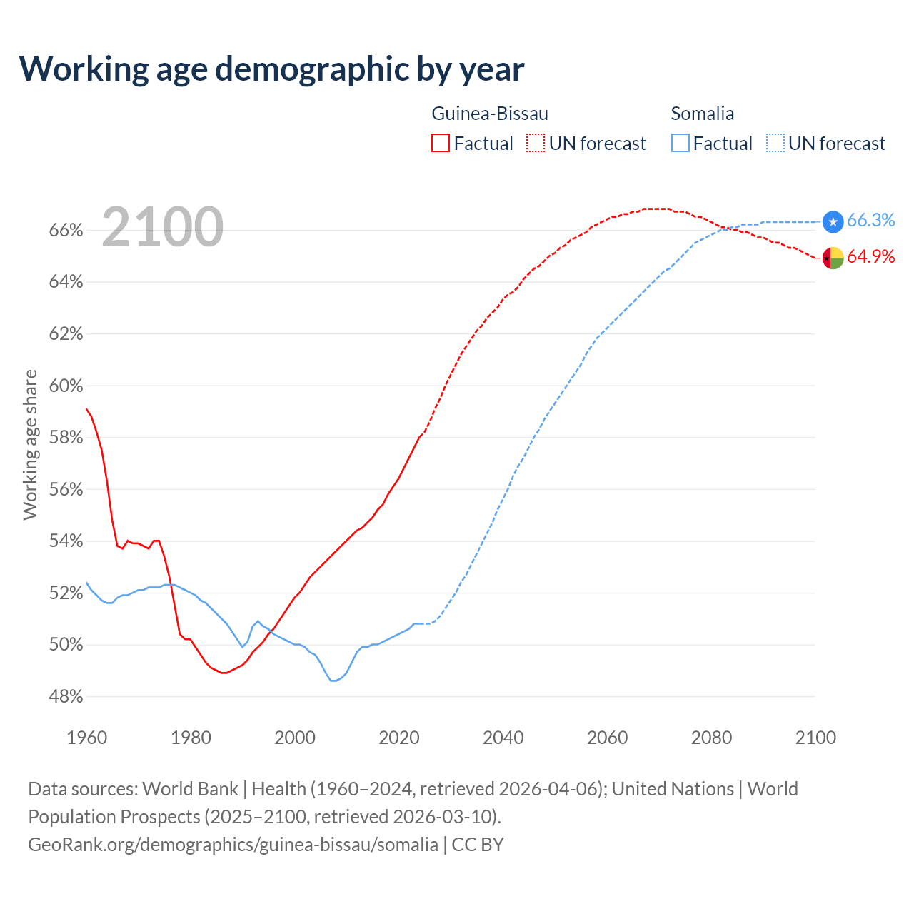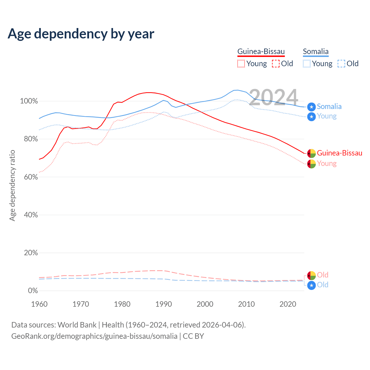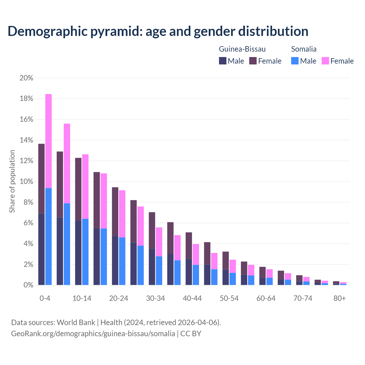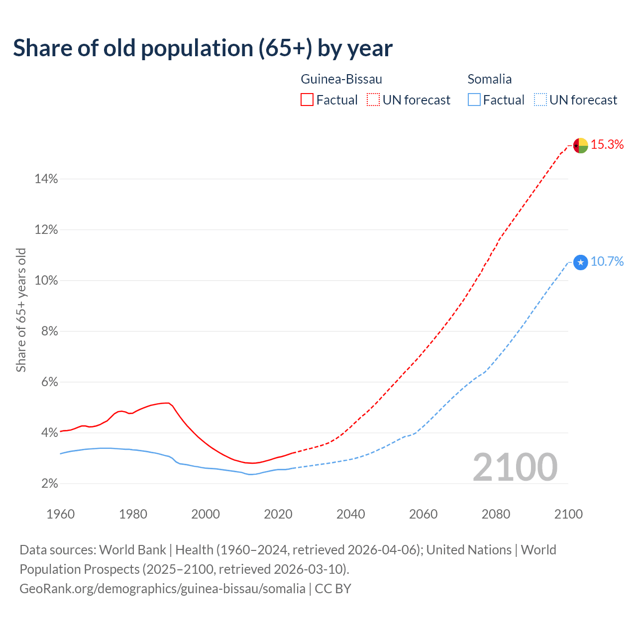- The share of old-age demographic (65+) in Guinea-Bissau is 3.19% vs 2.59% in Somalia.