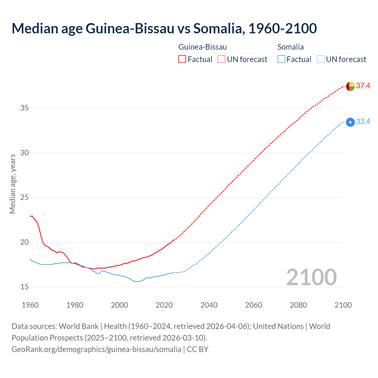 Median age Guinea-Bissau vs Somalia, 1960-2100