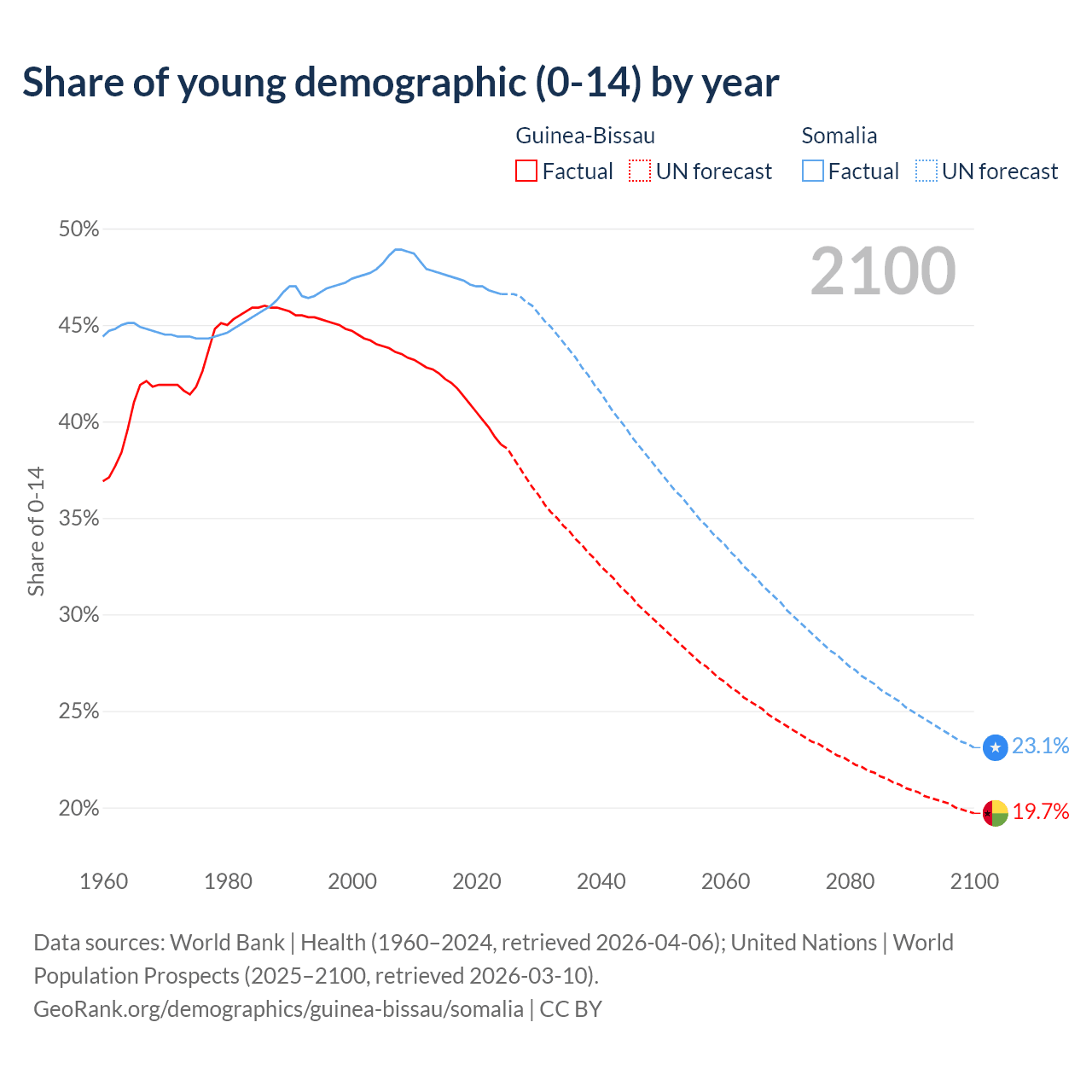 - The share of young demographic (0-15 years old) in Guinea-Bissau is 38.8% vs 46.6% in Somalia.