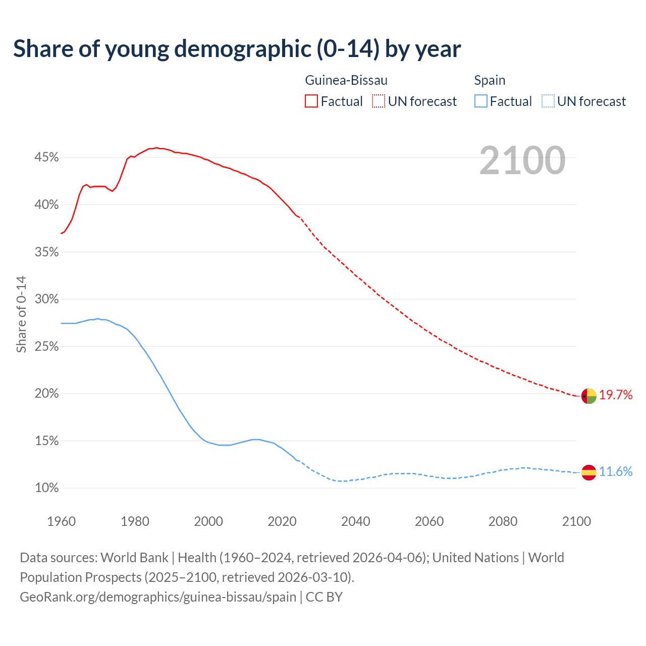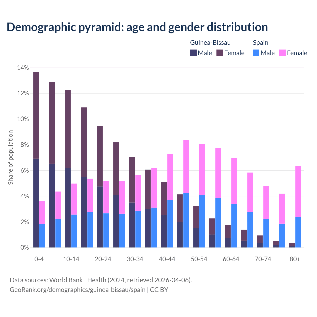 - The share of young demographic (0-15 years old) in Guinea-Bissau is 38.8% vs 12.9% in Spain.
