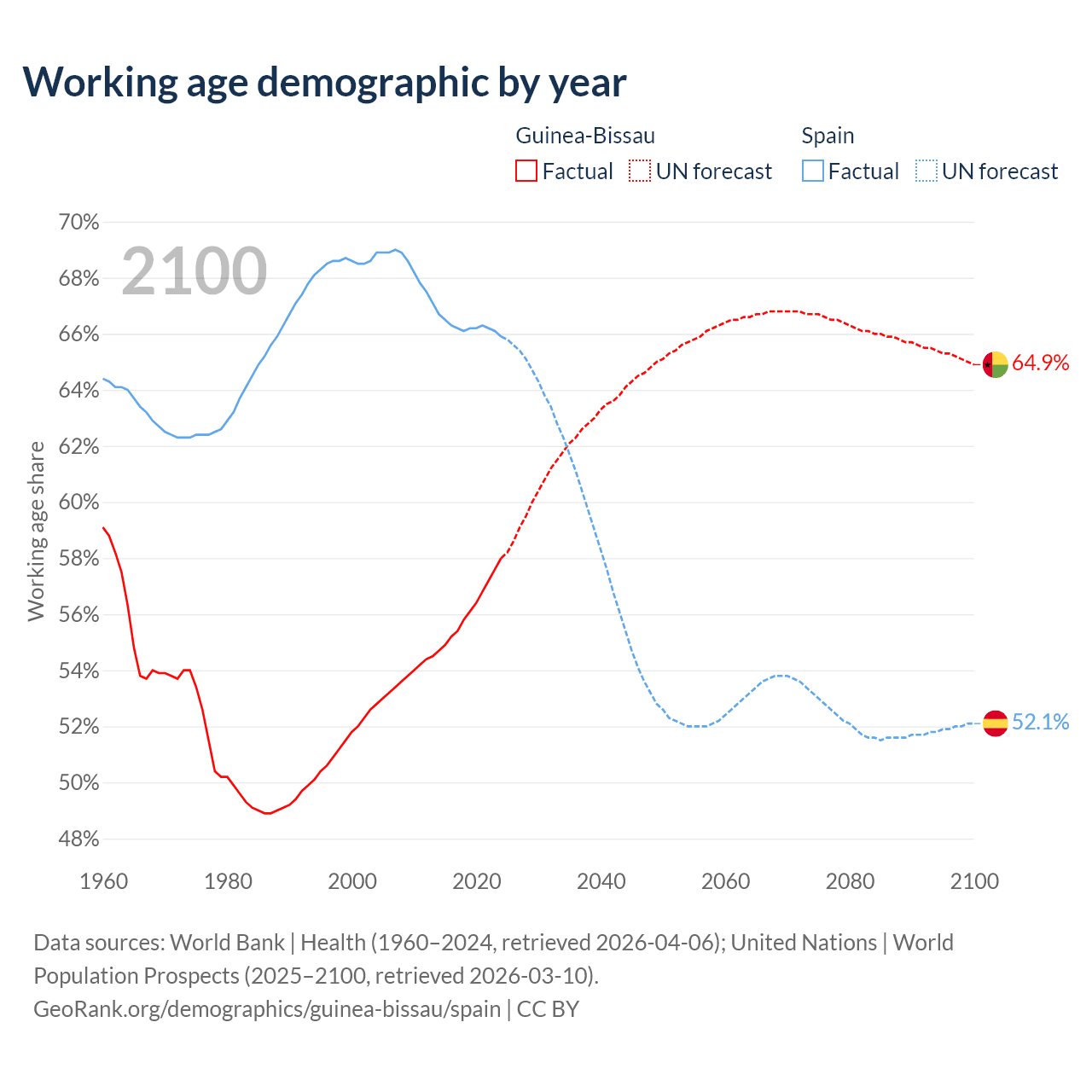 - The share of old-age demographic (65+) in Guinea-Bissau is 3.19% vs 21.1% in Spain.