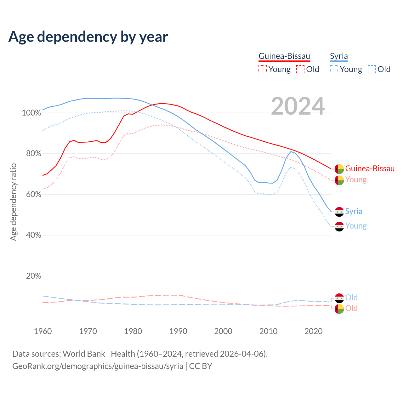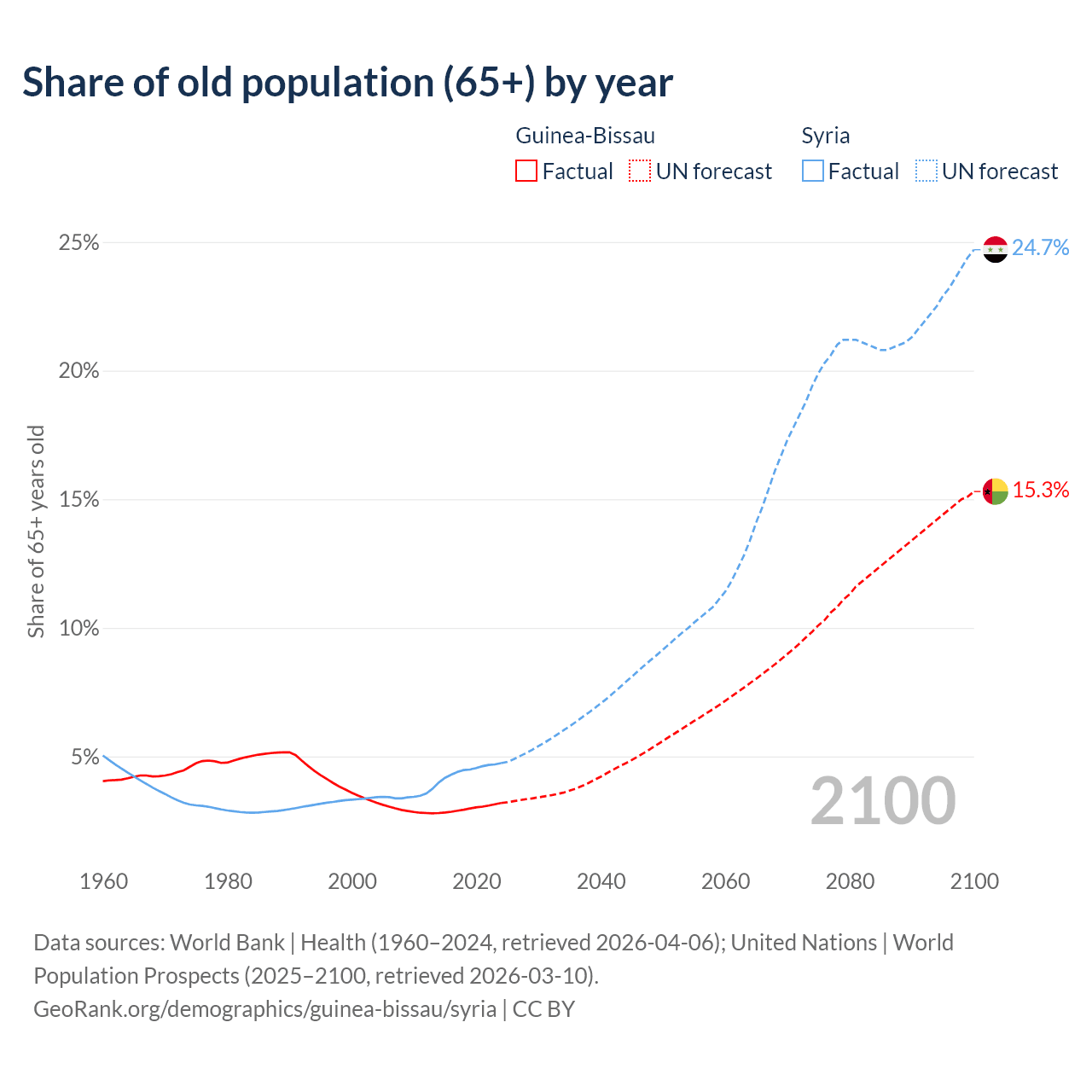 - The share of old-age demographic (65+) in Guinea-Bissau is 3.19% vs 4.74% in Syria.