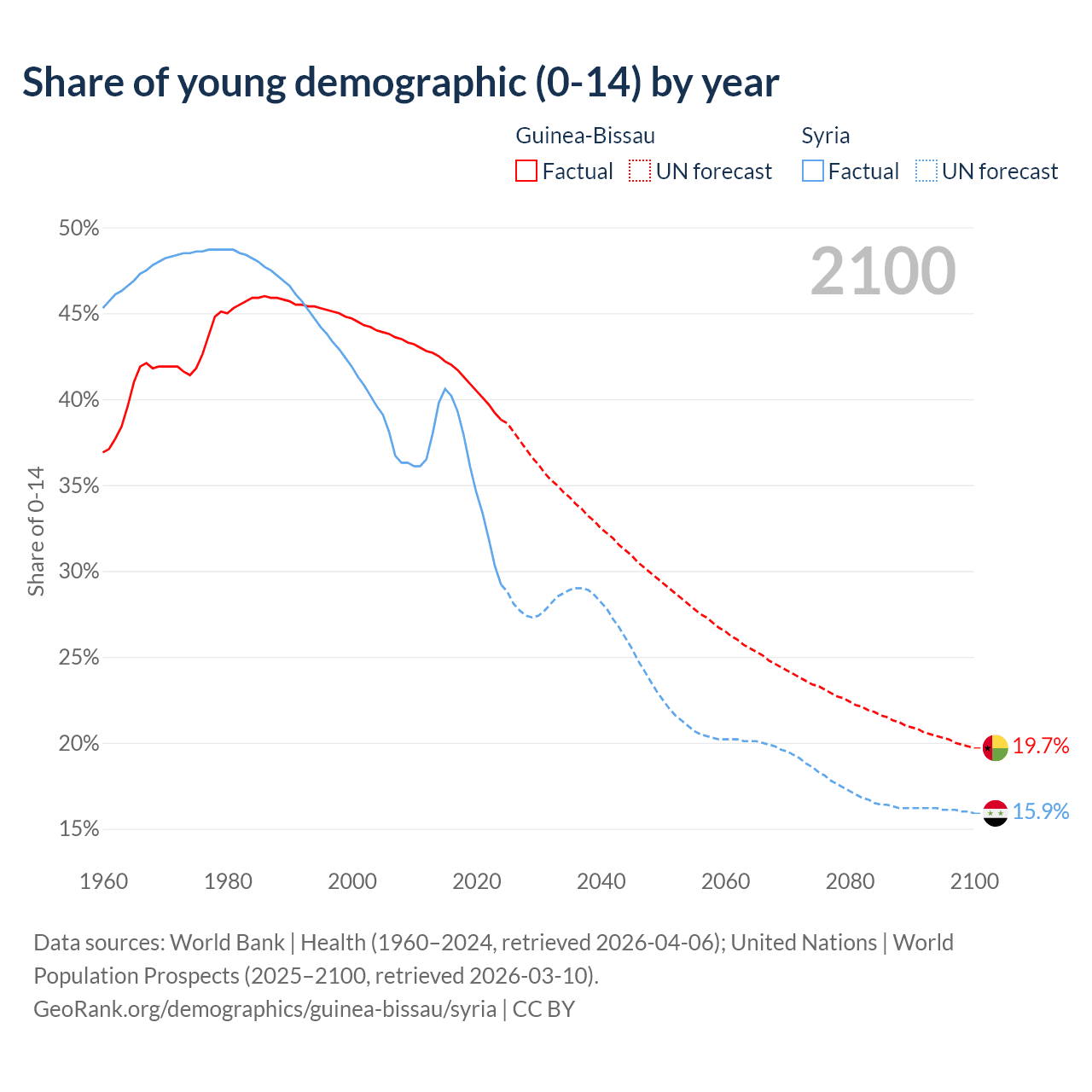 - The share of young demographic (0-15 years old) in Guinea-Bissau is 38.8% vs 29.2% in Syria.