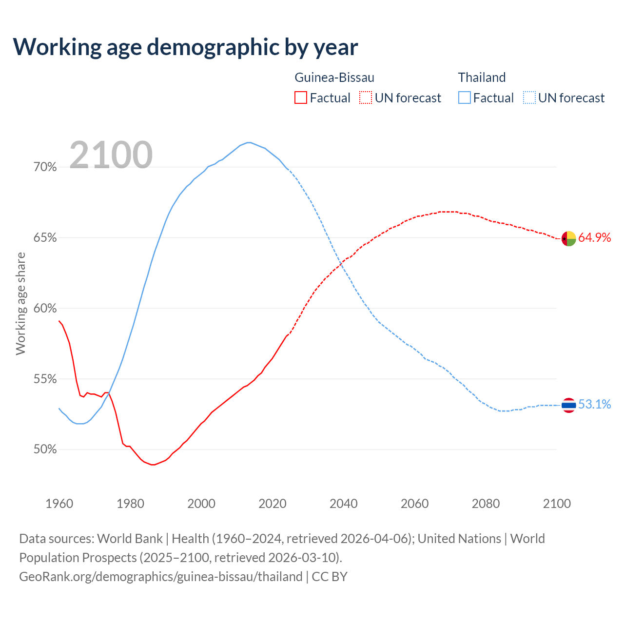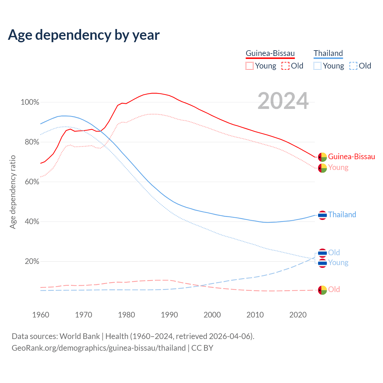 - Guinea-Bissau is ranked 164/196 by median age (oldest to youngest) vs 40/196 for Thailand.