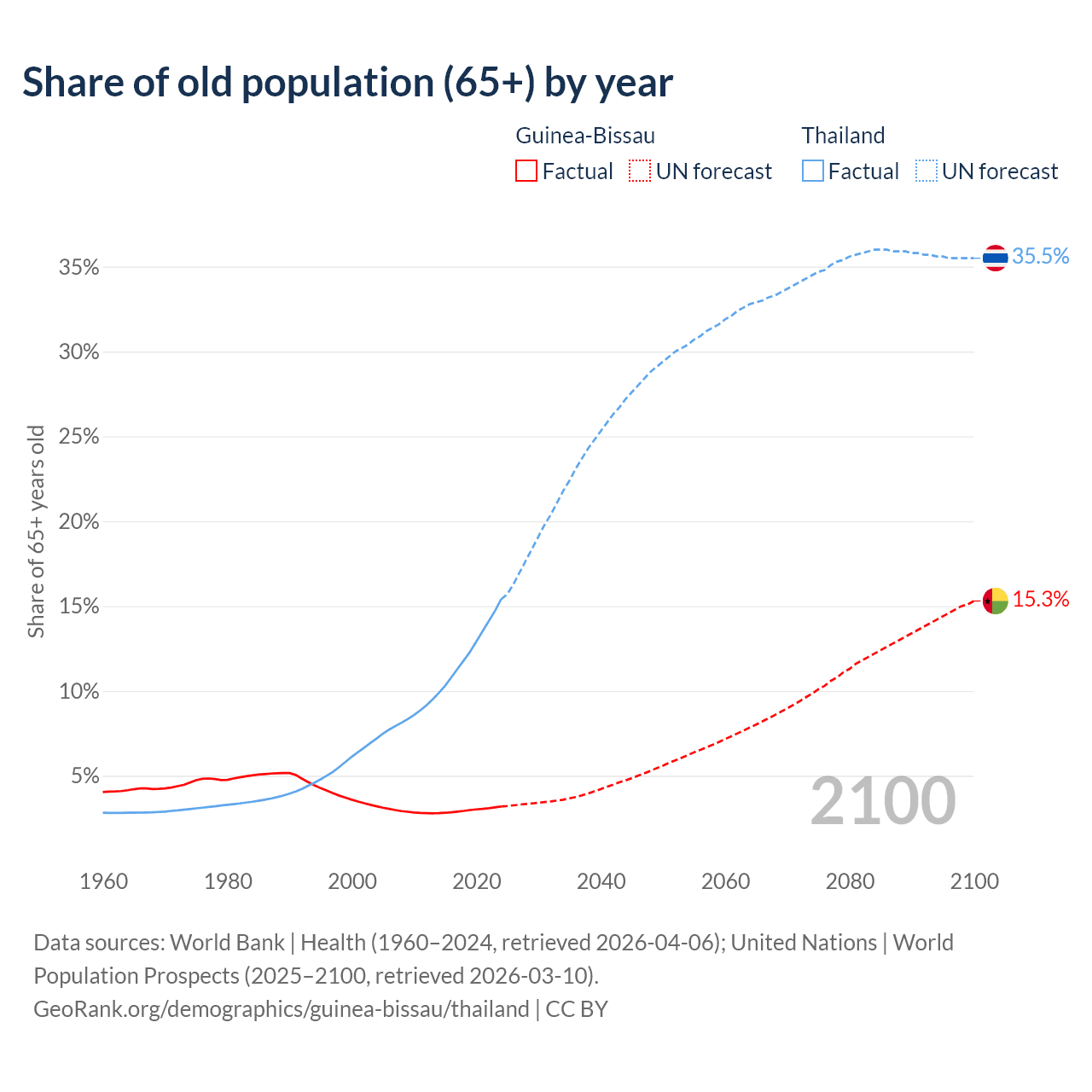 - The share of old-age demographic (65+) in Guinea-Bissau is 3.19% vs 15.4% in Thailand.