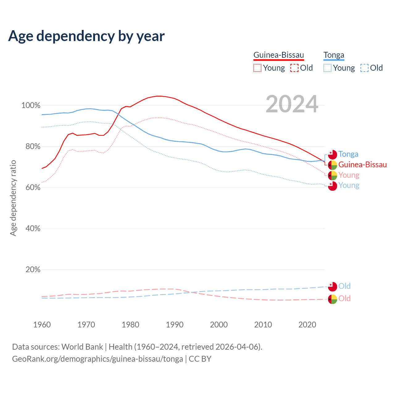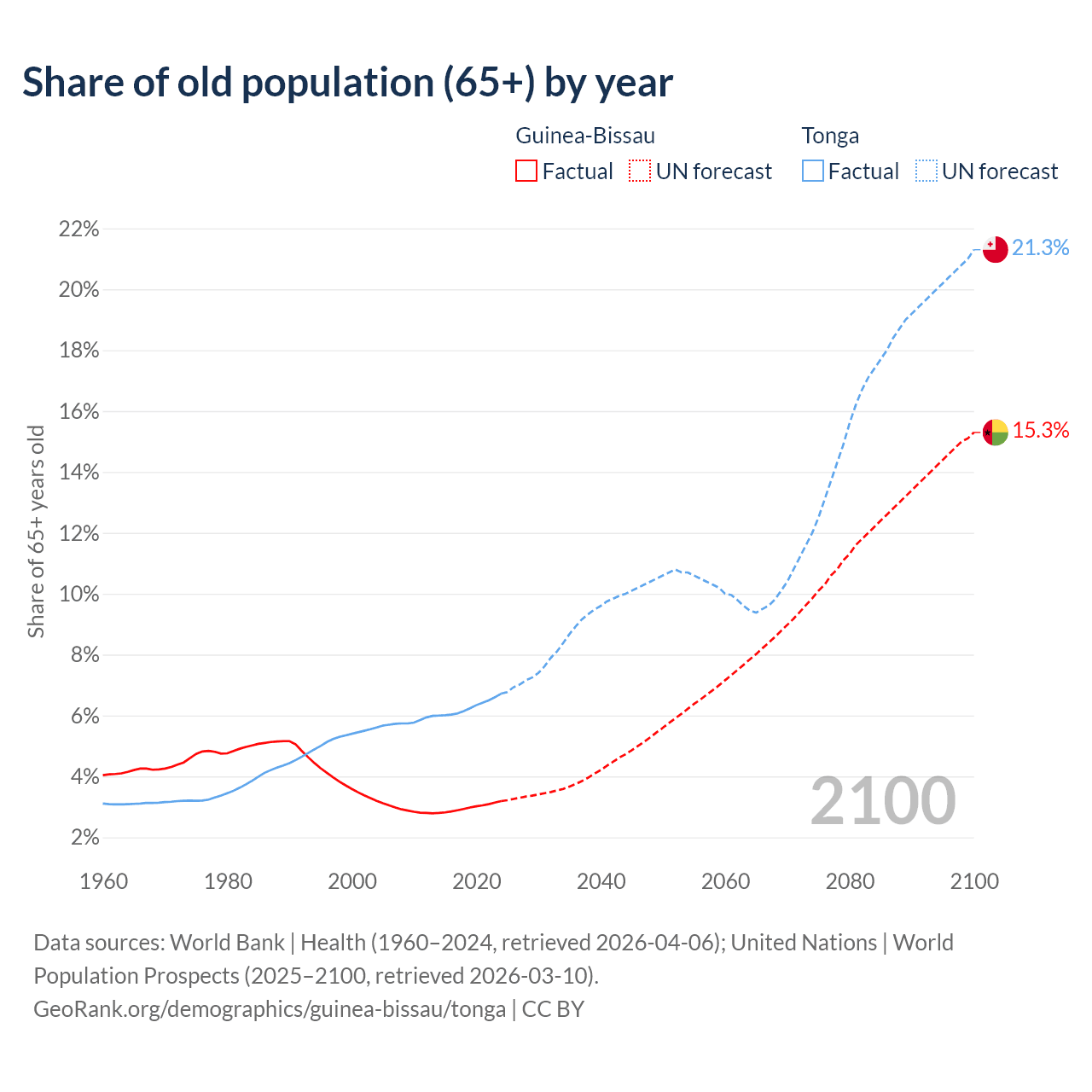 - The share of old-age demographic (65+) in Guinea-Bissau is 3.19% vs 6.72% in Tonga.