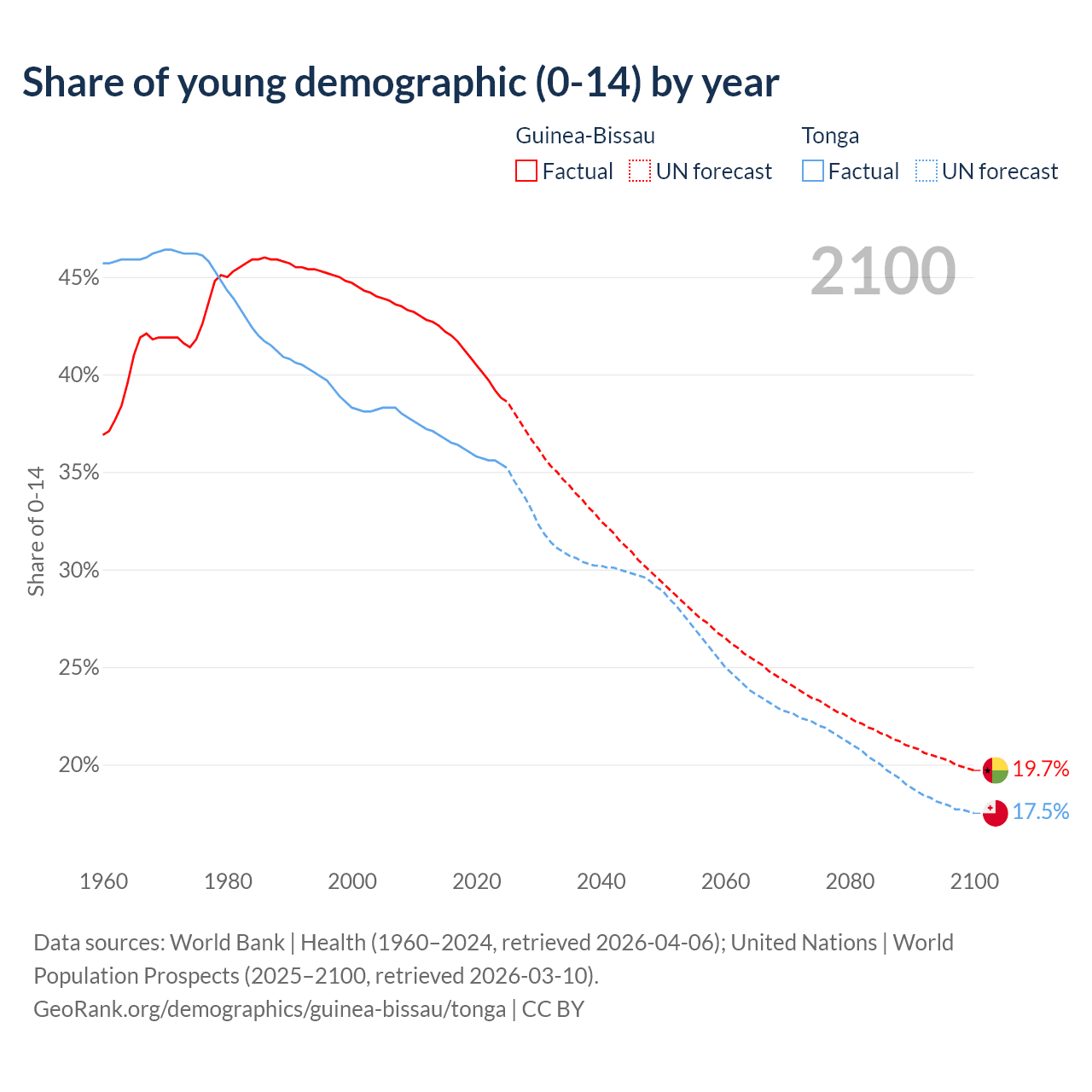 - The share of young demographic (0-15 years old) in Guinea-Bissau is 38.8% vs 35.4% in Tonga.