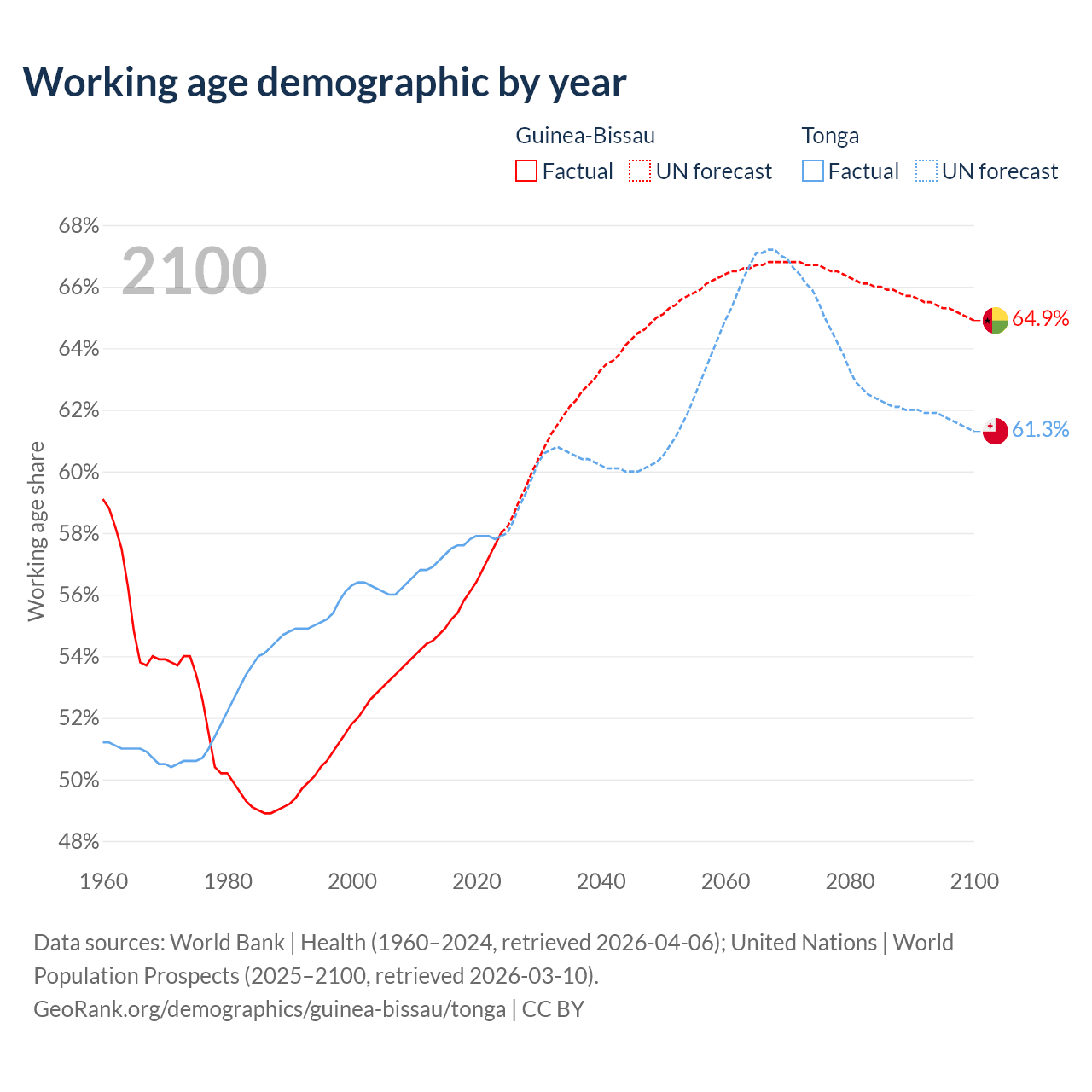 - Guinea-Bissau has 1.34M working age adults (aged 15-64) vs 59.8K in Tonga.