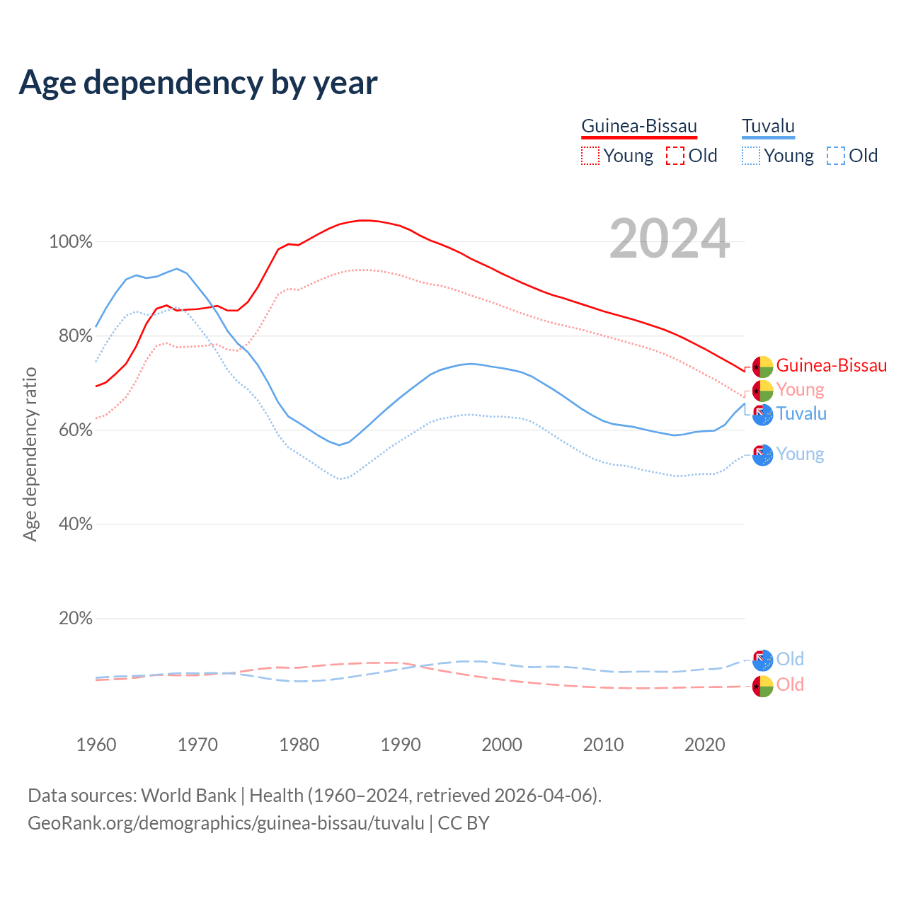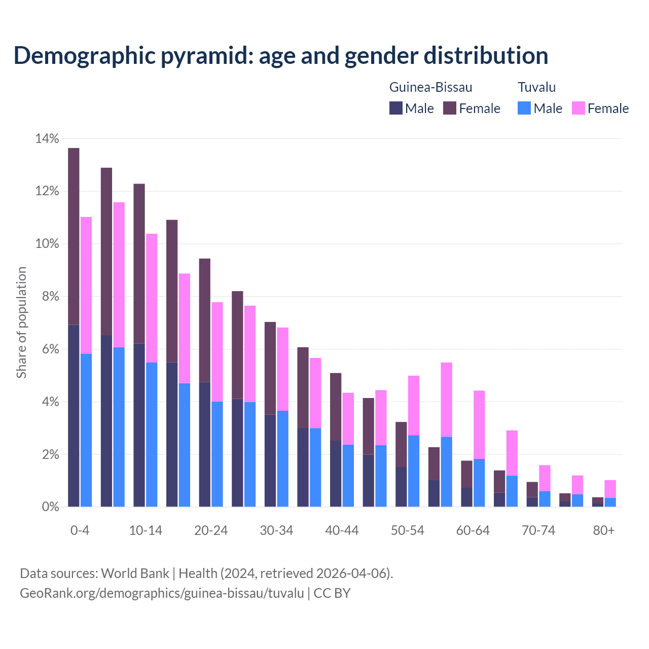 - The share of old-age demographic (65+) in Guinea-Bissau is 3.19% vs 6.67% in Tuvalu.