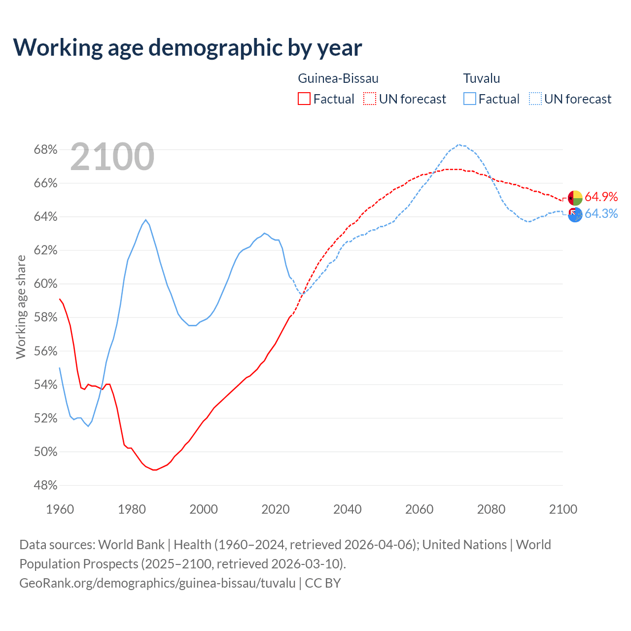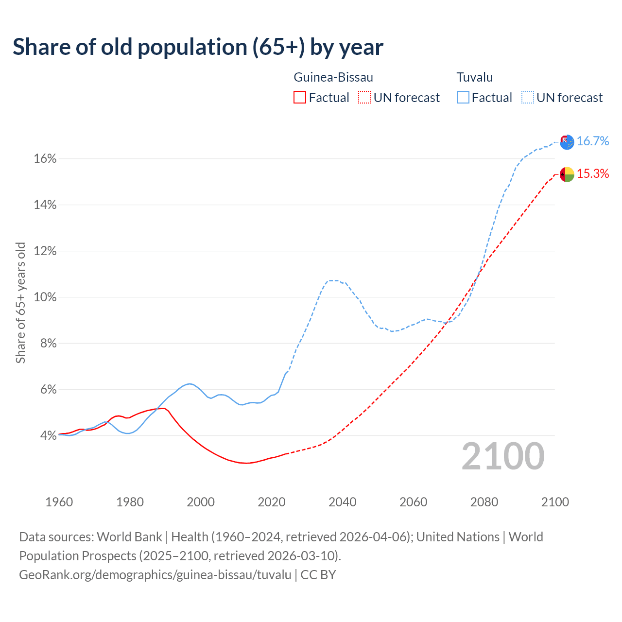 The share of older people aged 65 and over is 3.19% in Guinea-Bissau and 6.67% in Tuvalu. Life expectancy in Guinea-Bissau compared to Tuvalu .