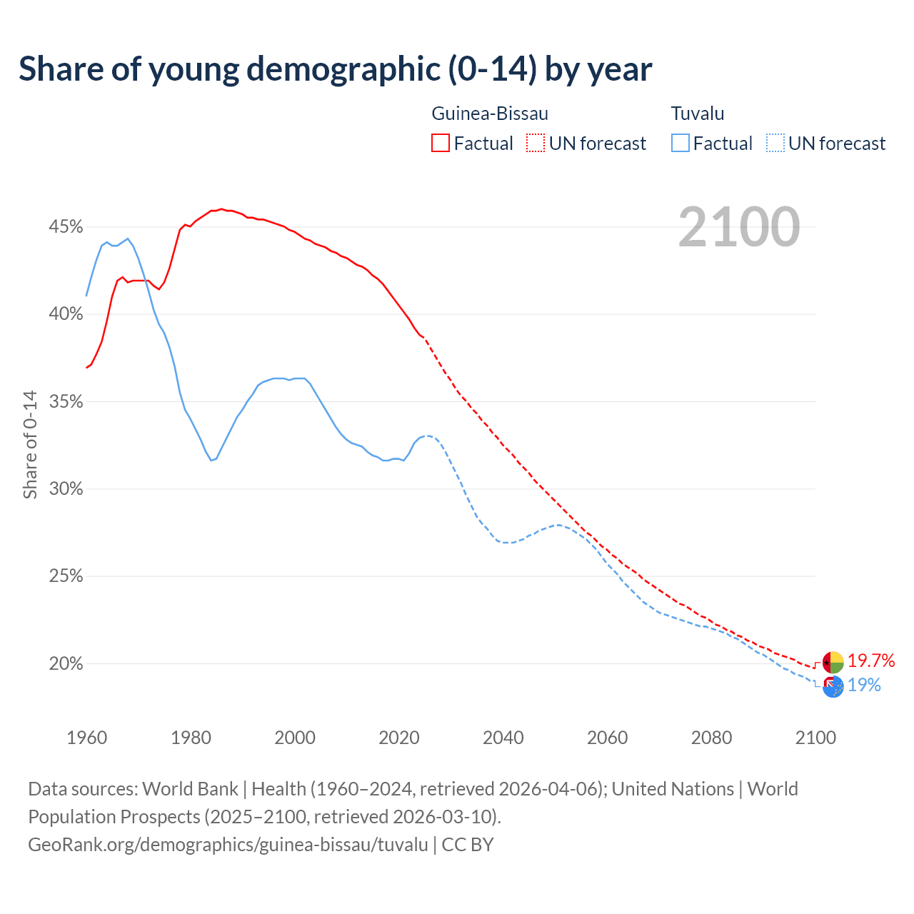 - The share of young demographic (0-15 years old) in Guinea-Bissau is 38.8% vs 32.9% in Tuvalu.