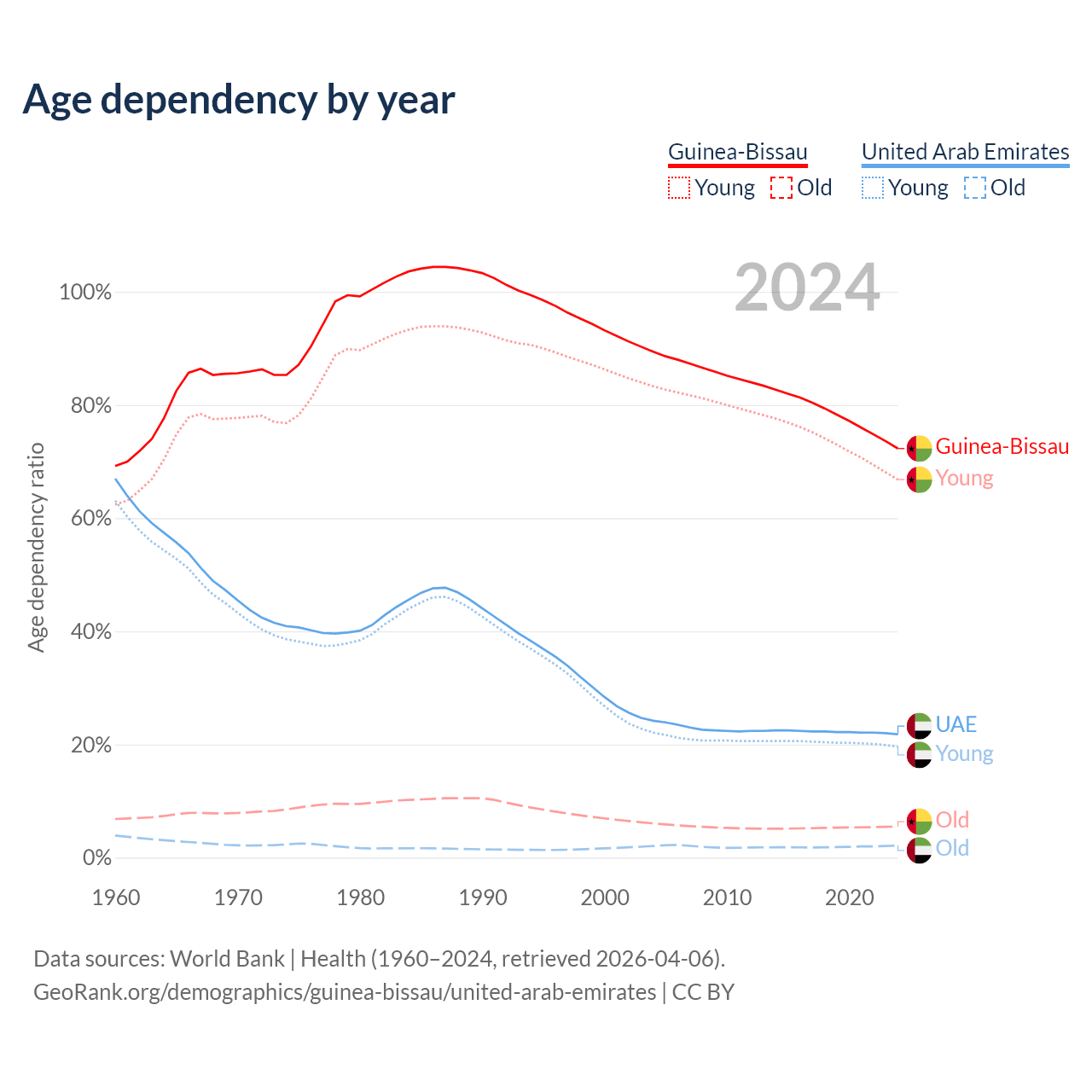 - The share of old-age demographic (65+) in Guinea-Bissau is 3.19% vs 1.77% in the United Arab Emirates.