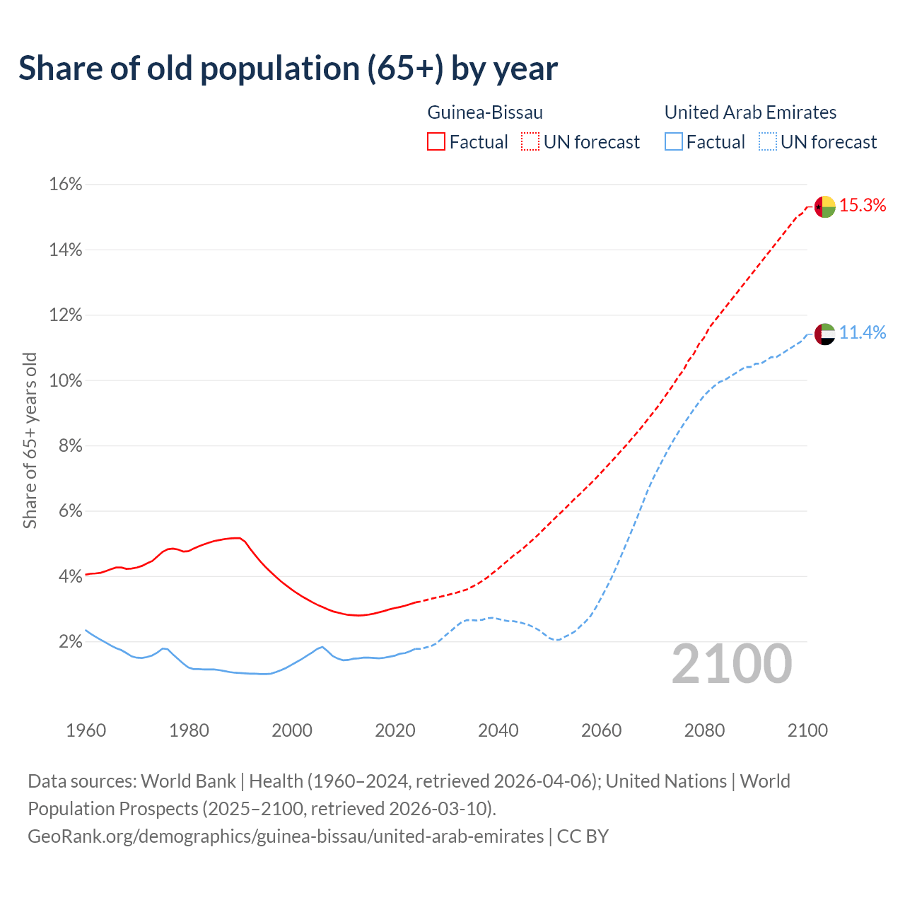 The share of older people aged 65 and over is 3.19% in Guinea-Bissau and 1.77% in the United Arab Emirates. Life expectancy in Guinea-Bissau compared to the United Arab Emirates .