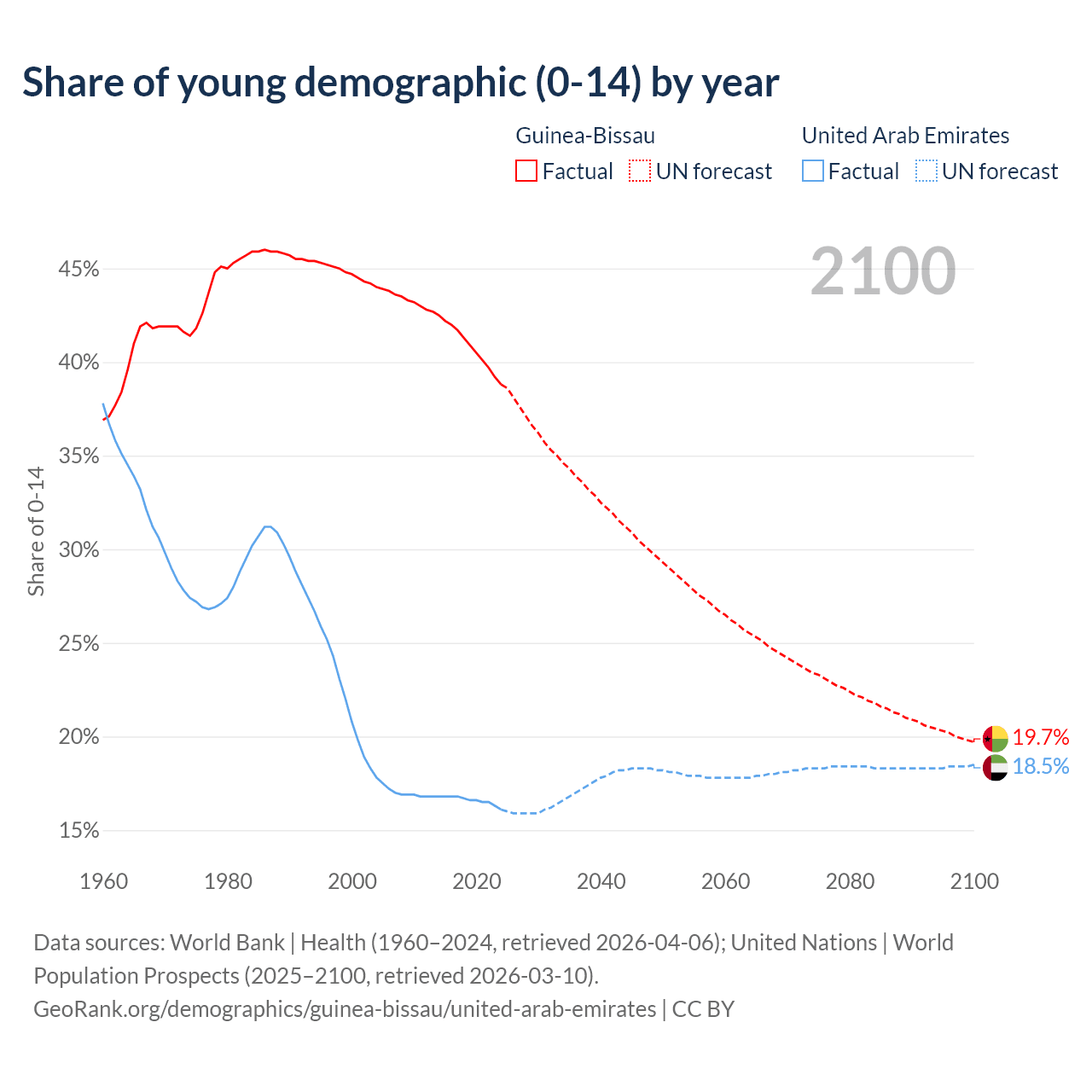 - The share of young demographic (0-15 years old) in Guinea-Bissau is 38.8% vs 16.1% in the United Arab Emirates.