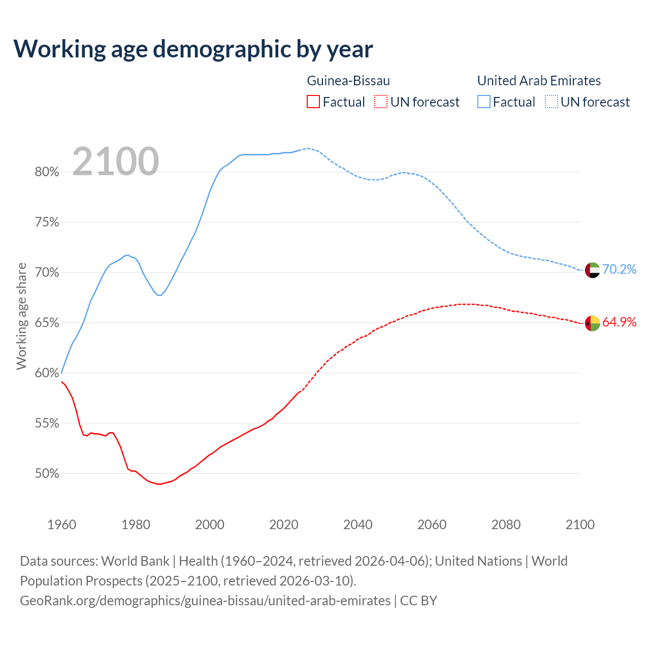 Median age Guinea-Bissau vs United Arab Emirates, 1960-2100