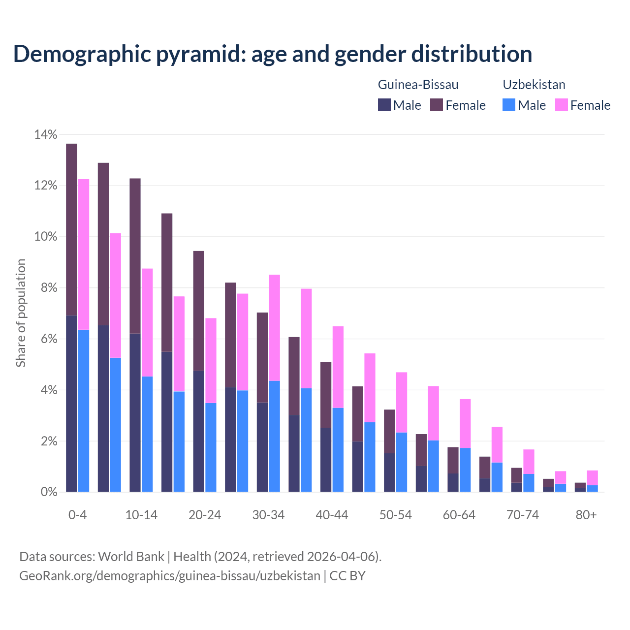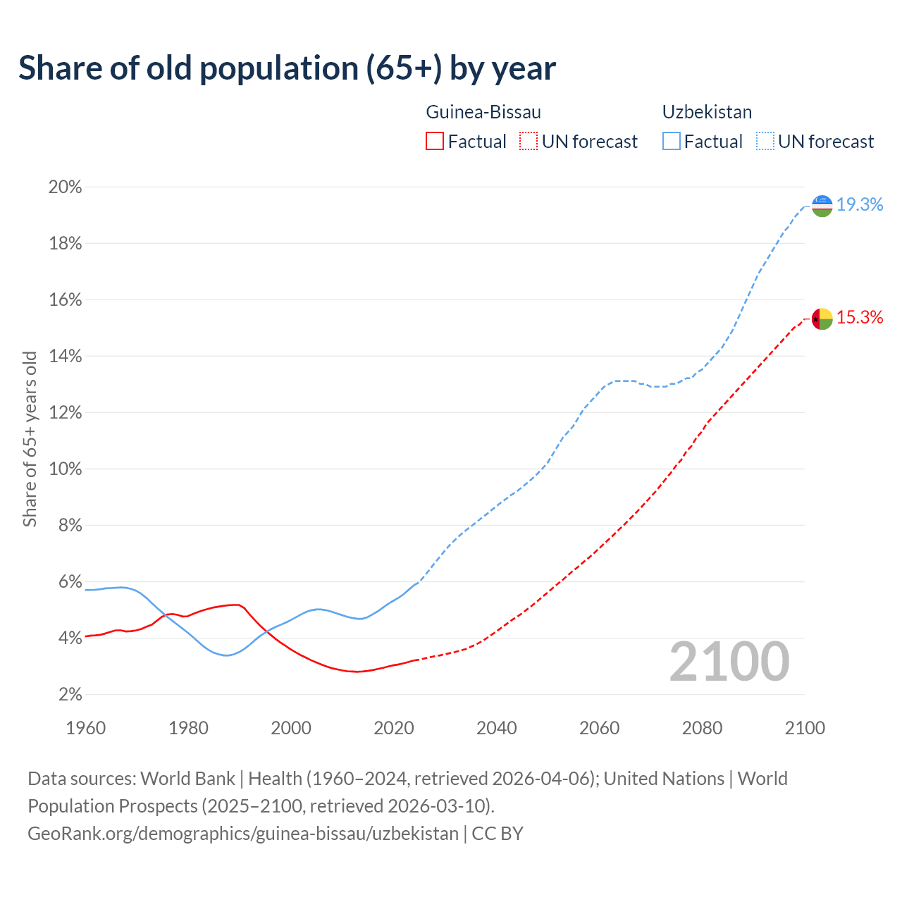 - The share of old-age demographic (65+) in Guinea-Bissau is 3.19% vs 5.86% in Uzbekistan.