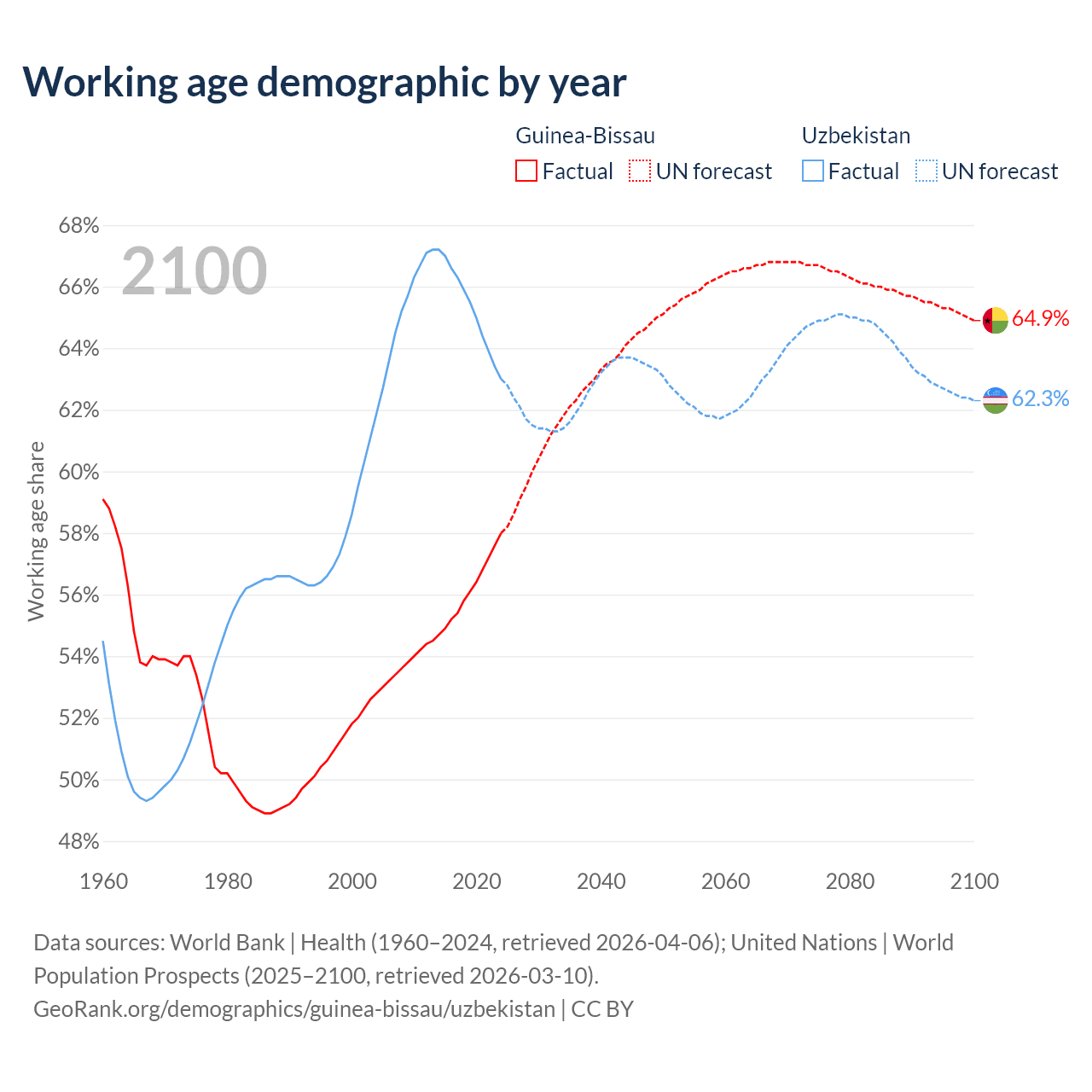 - Guinea-Bissau has 1.34M working age adults (aged 15-64) vs 23.9M in Uzbekistan.
