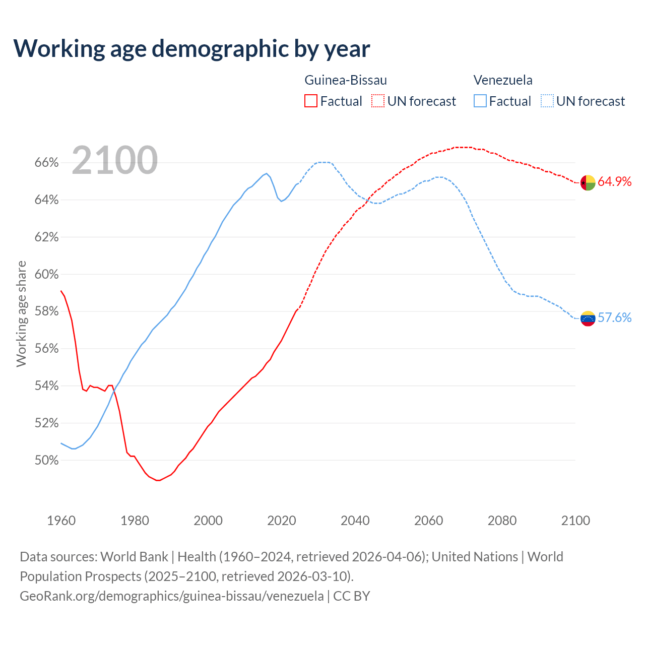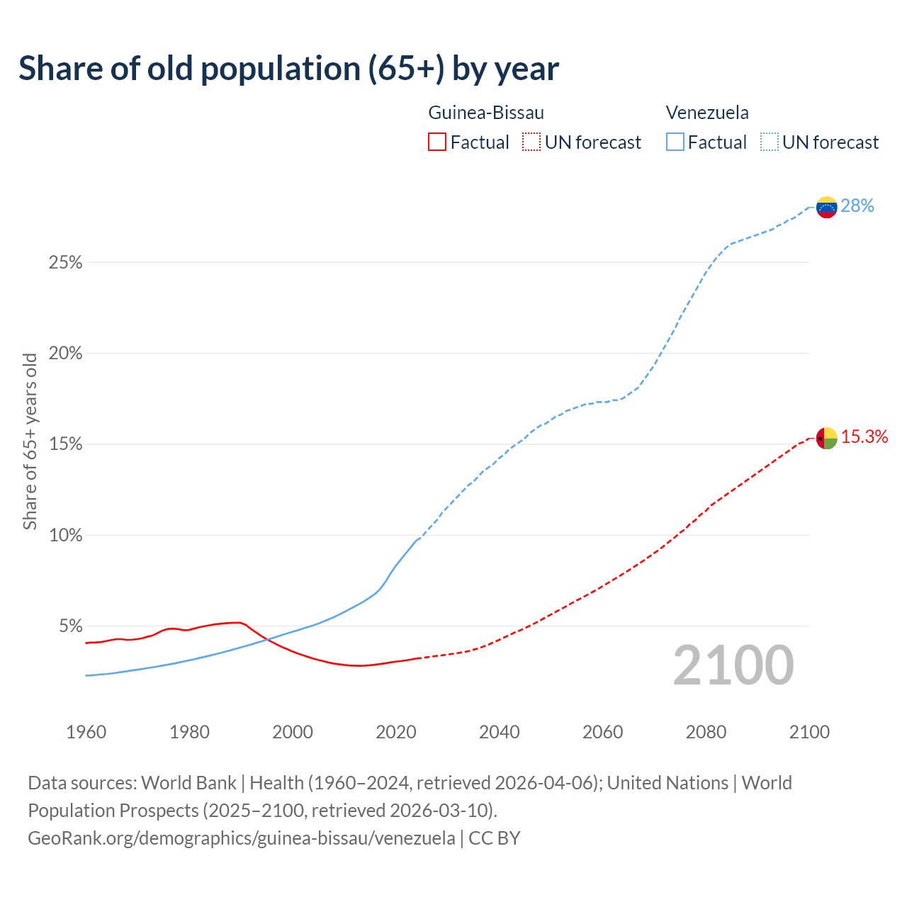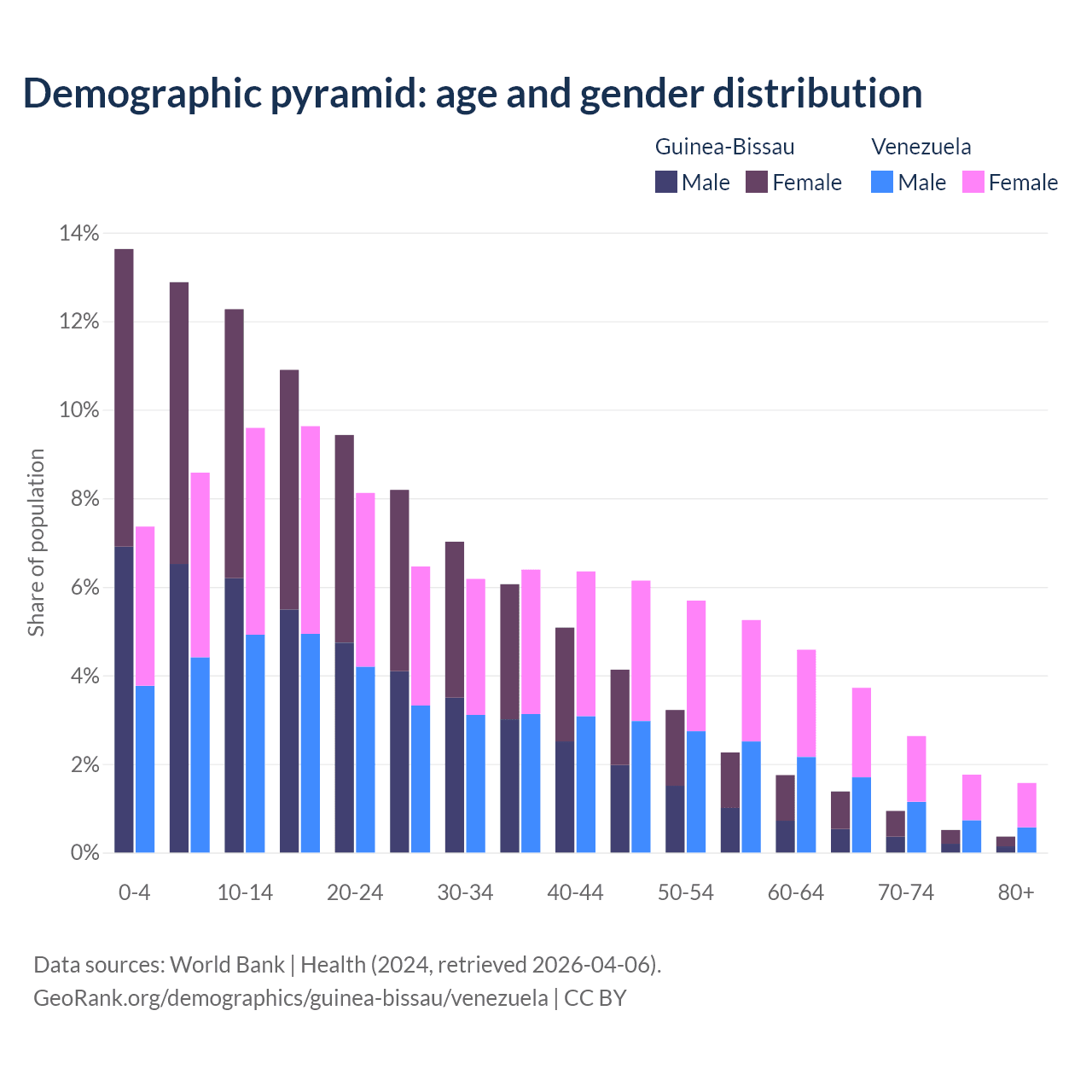 - The share of old-age demographic (65+) in Guinea-Bissau is 3.19% vs 9.68% in Venezuela.