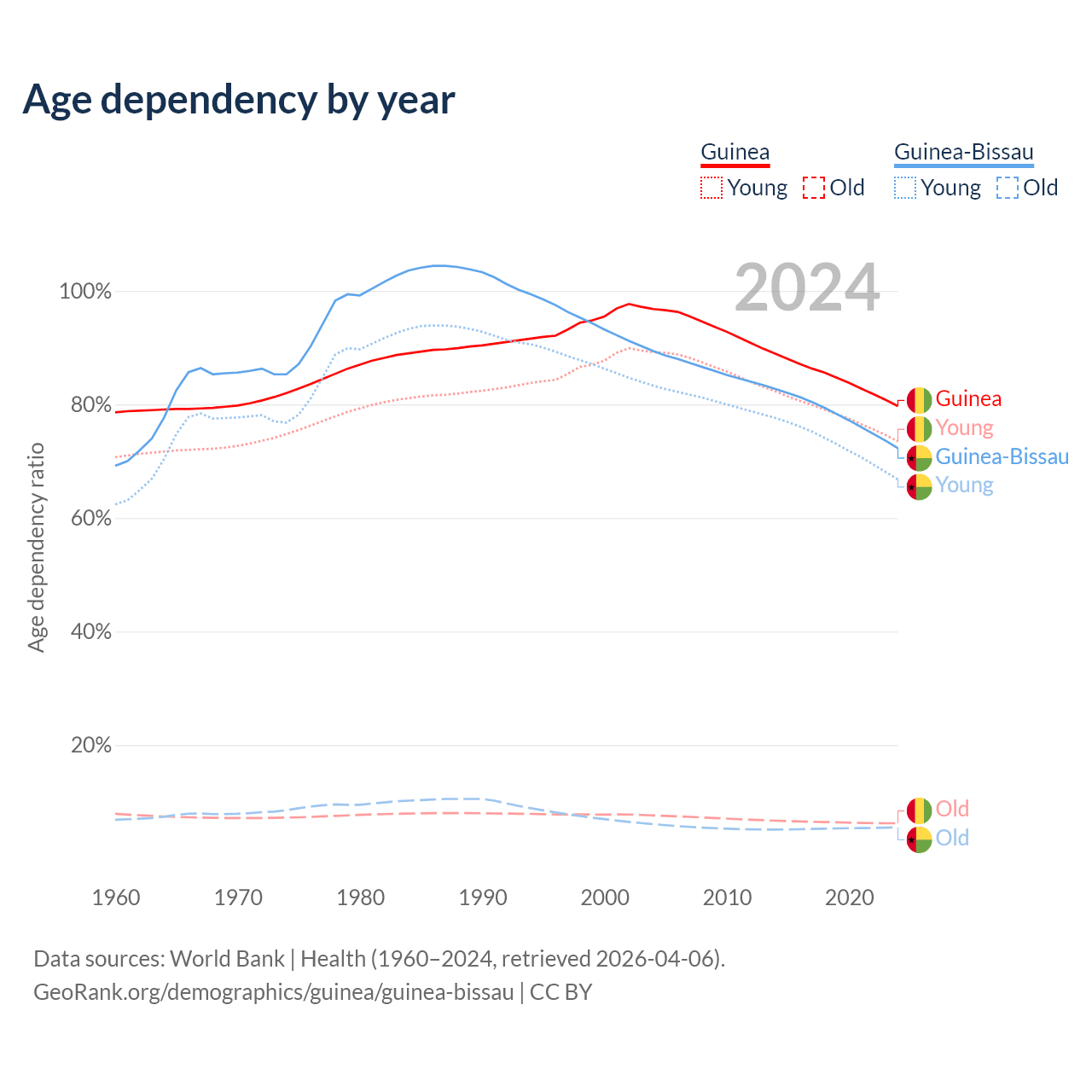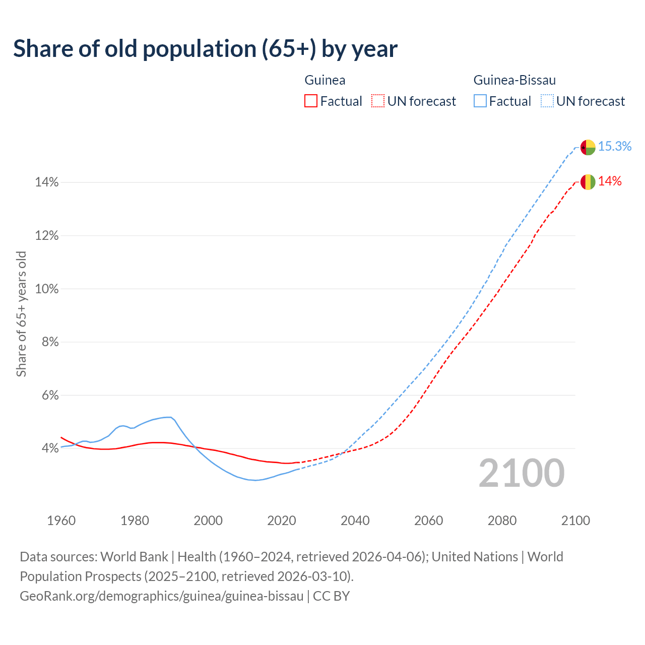 - The share of old-age demographic (65+) in Guinea is 3.46% vs 3.19% in Guinea-Bissau.