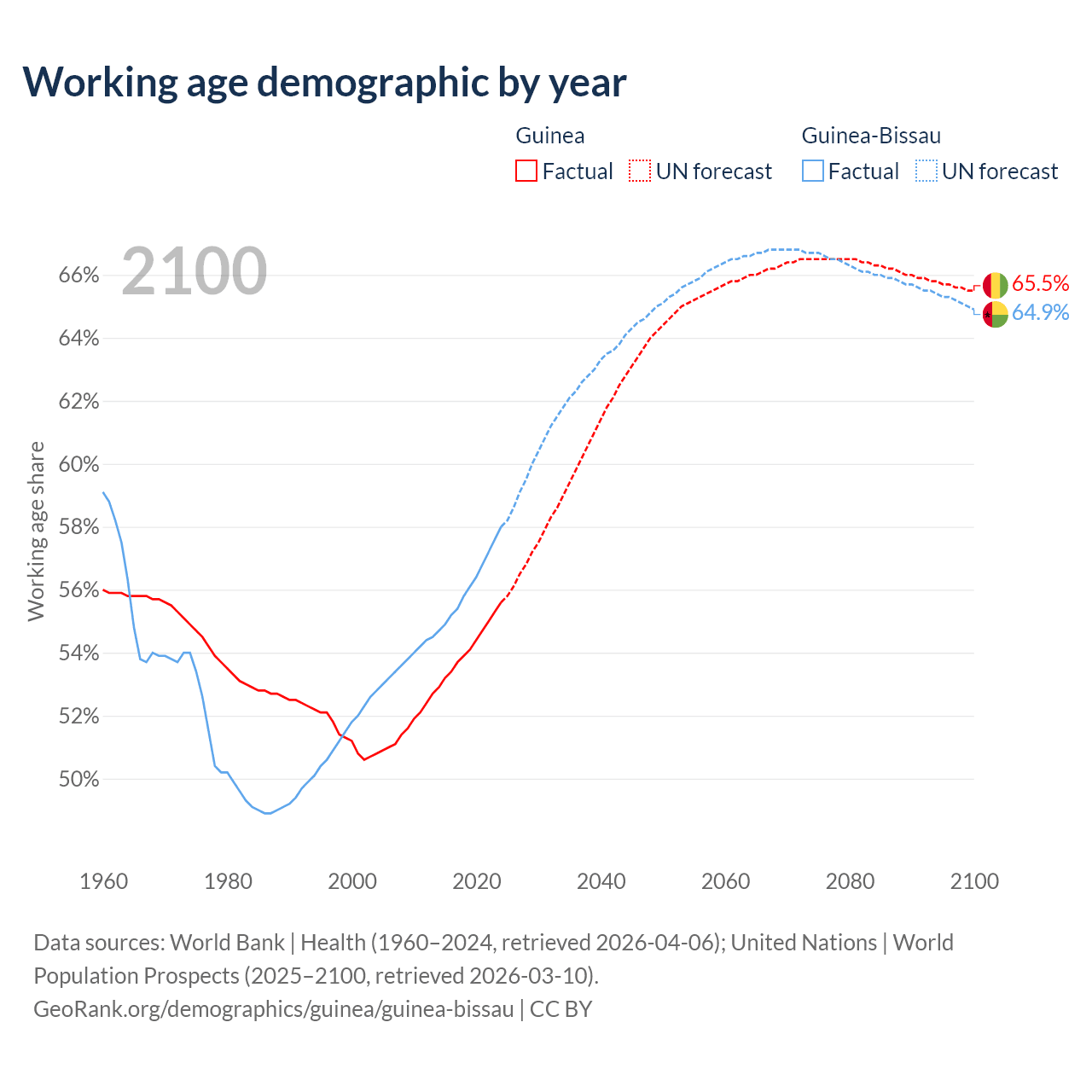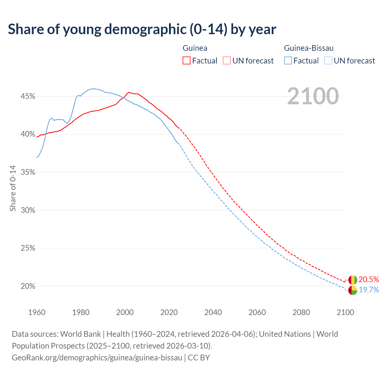Median age Guinea vs Guinea-Bissau, 1960-2100