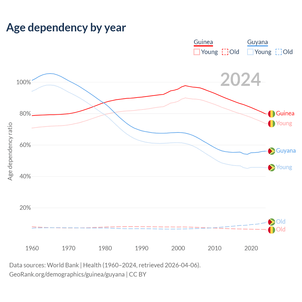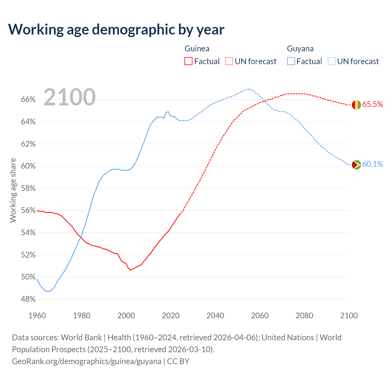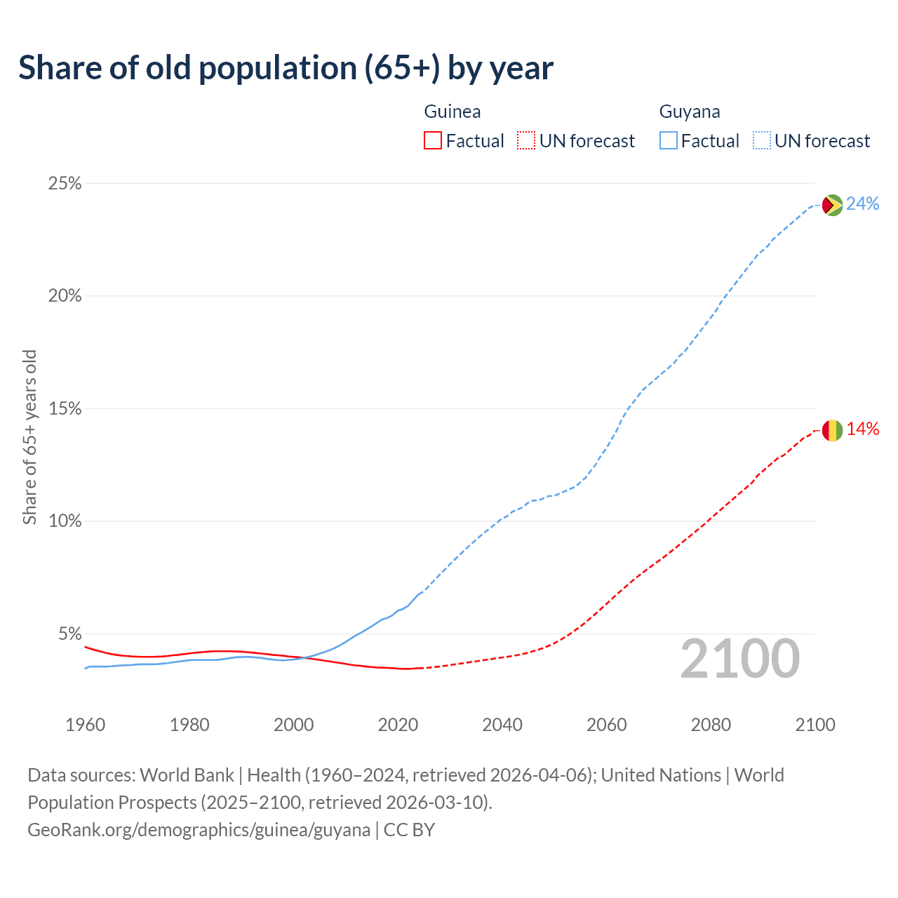 - The share of old-age demographic (65+) in Guinea is 3.46% vs 6.73% in Guyana.
