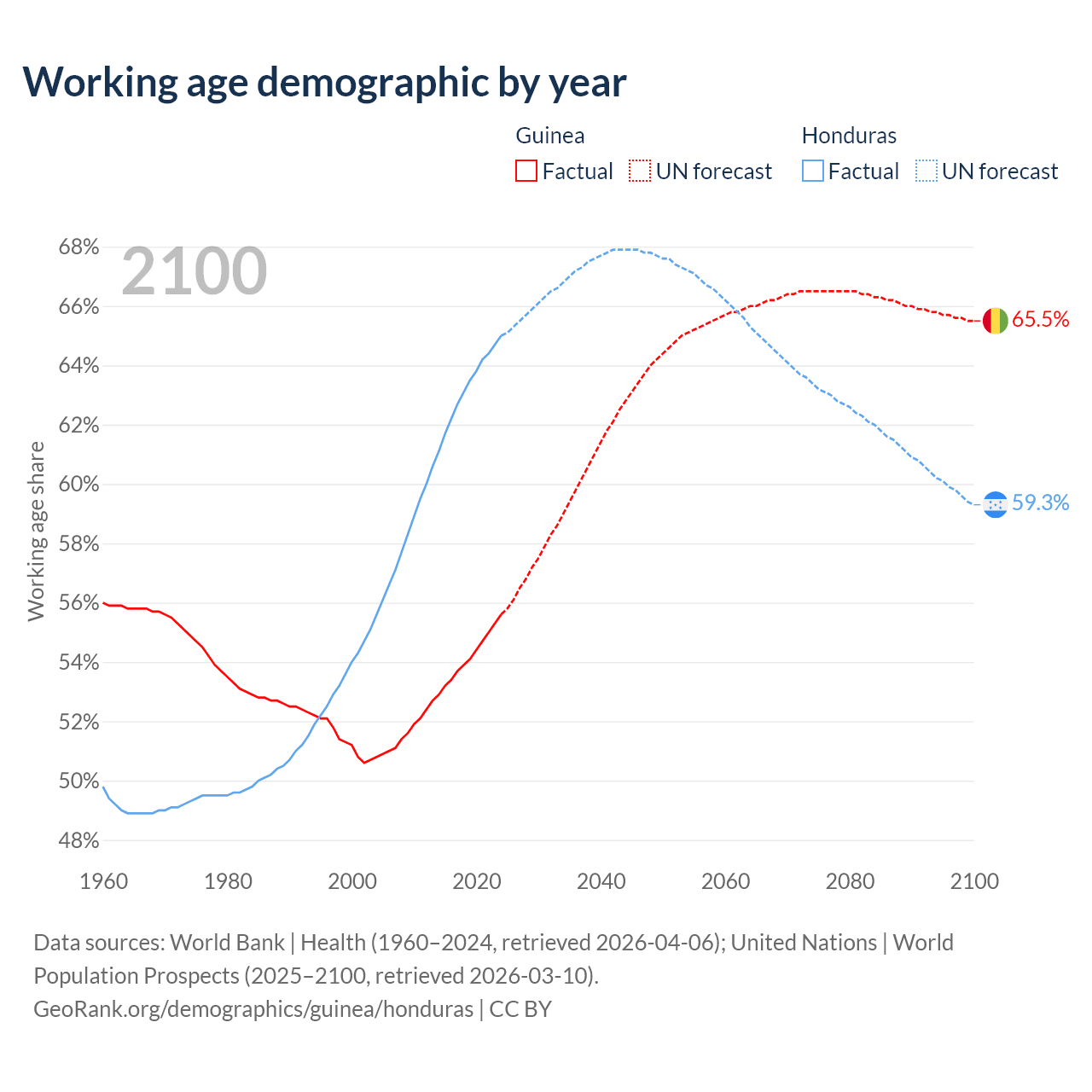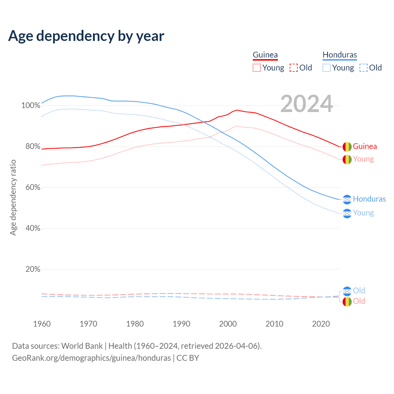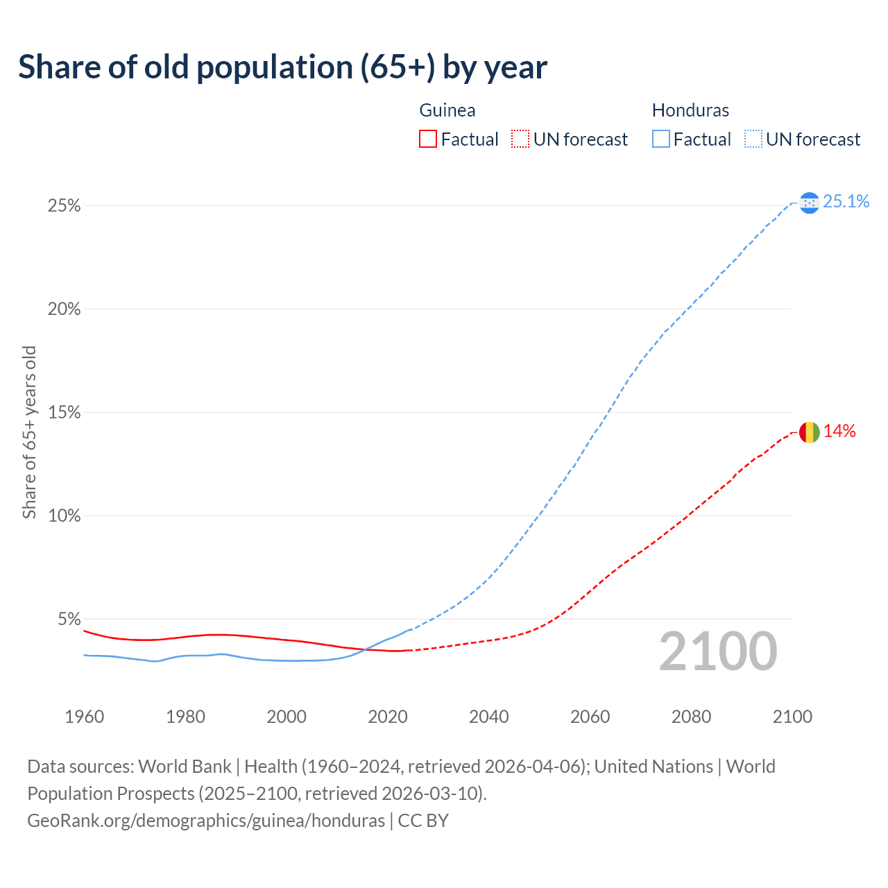 - The share of old-age demographic (65+) in Guinea is 3.46% vs 4.42% in Honduras.