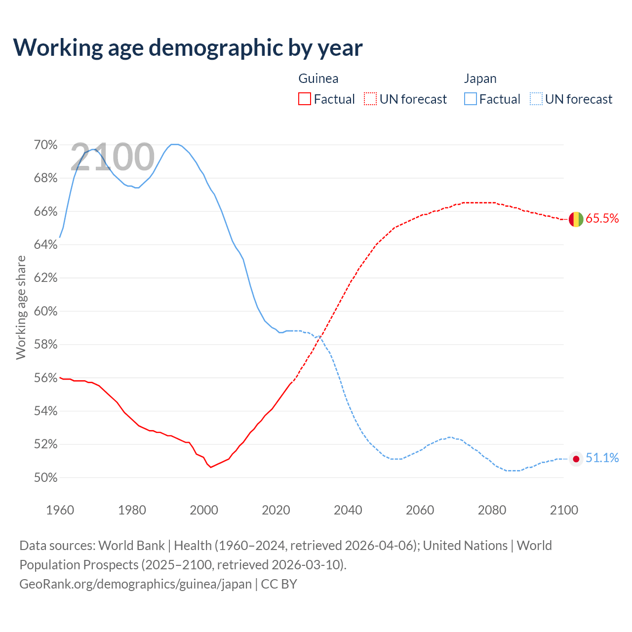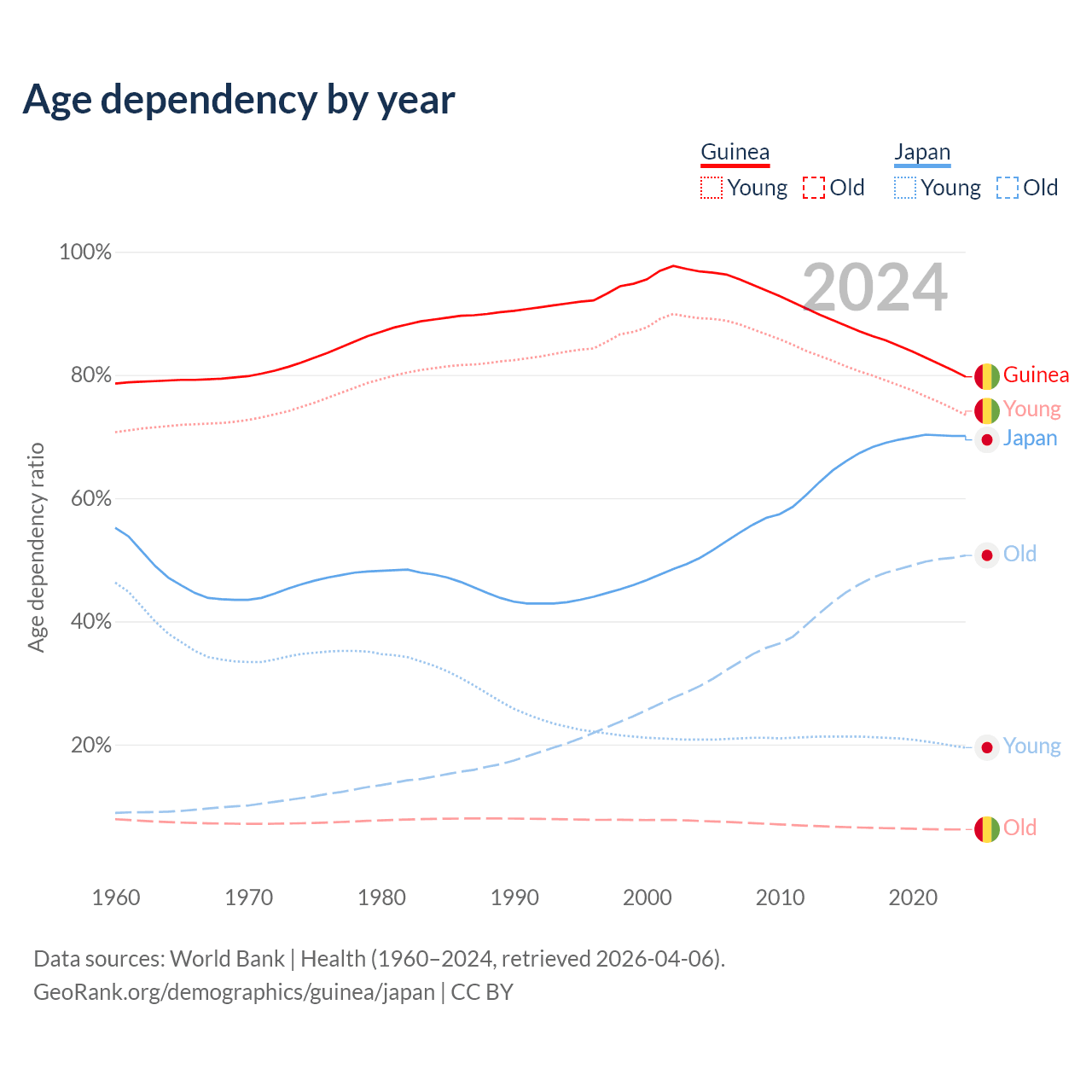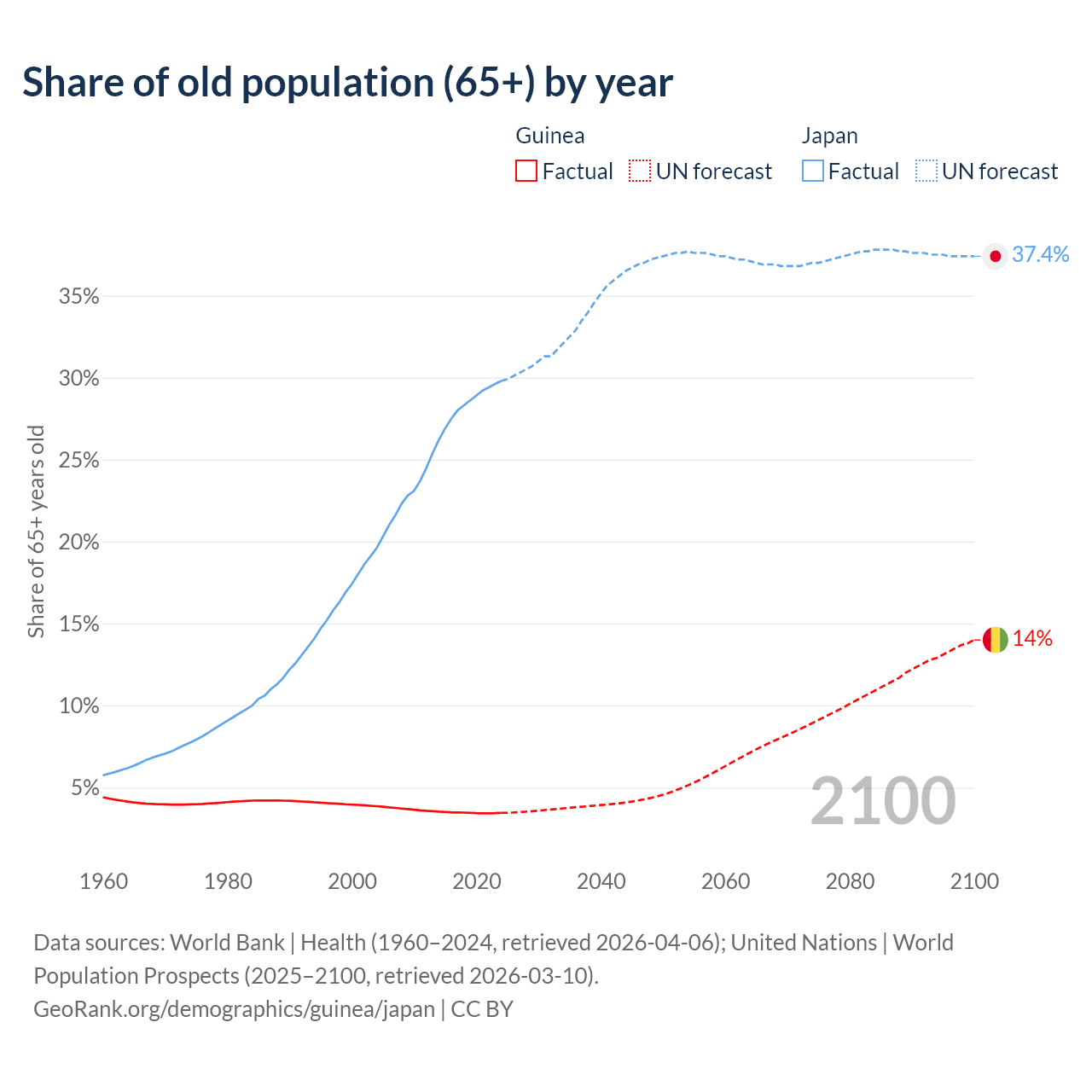 The share of older people aged 65 and over is 3.46% in Guinea and 29.8% in Japan. Life expectancy in Guinea compared to Japan .
