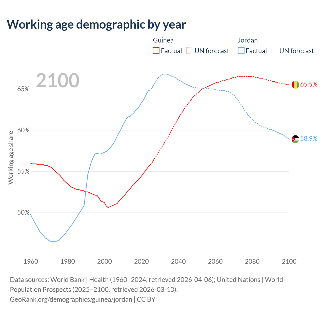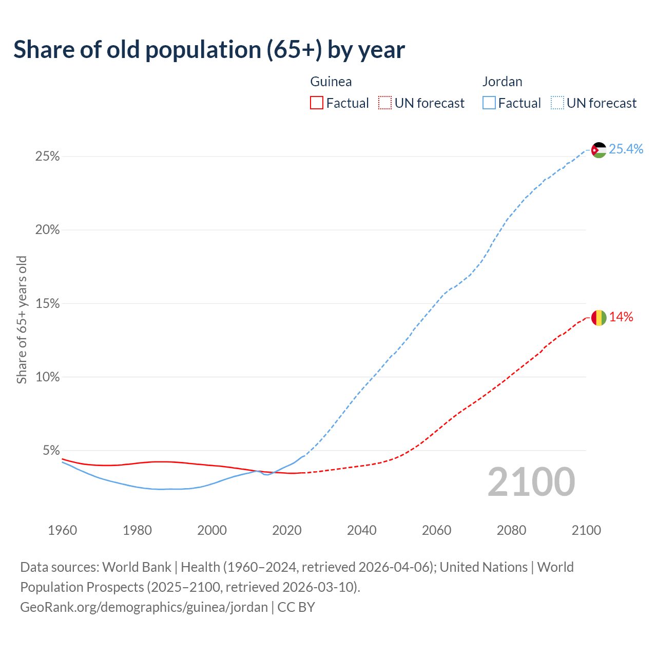 Median age Guinea vs Jordan, 1960-2100